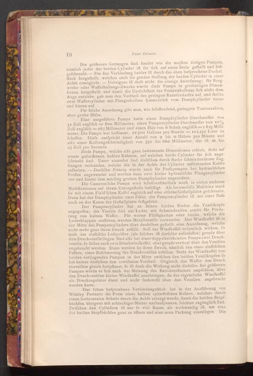 Der Pumpen cylinder hat an feinen beiden Enden die Ventilköpfe angegoffen; die Ventile find aus Leder, mit Schmiedeeifen armirt für Förderung von kaltem Waffer. Für warme Flüffigkeiten oder folche, welche die Lederklappen zerftören, werden Metallventile verwendet. Der Windkeffel ift in der Mitte des Pumpencylinders über denfelben geftellt, eine Anordnung, welche nicht mehr ganz ihren Zweck erfüllt. Soll der Windkeffel ordentlich wirken, fo mufs das elaftifche Luftpolfter( als folches ift derfelbe aufzufaffen) gerade über dem Druckventile liegen Sind alfo bei einer doppeltwirkenden Pumpe zwei Druckventile, fo follen auch zwei Druckwindkeffel, aber gerade vertical über den Ventilen angebracht werden. Dann werden fie ihren Zweck, nämlich den eines elaftifchen Puffers, einer Befchwerung des Druckventiles erfüllen. Steht der Windkeffel von beiden vorliegenden Pumpen in der Mitte zwifchen den beiden Ventilköpfen fo hat keines derfelben den erwähnten Vortheil. Obgleich das Waffer den Druck überallhin gleich fortpflanzt, fo ift doch die Wirkung nicht diefelbe. Bei grösseren Pumpen würde es fich nach der Meinung des Berichterftatters empfehlen, über den Druckventilen kleine Windkeffel anzubringen, da der eigentliche Windkeffel als Druckregulator dient und nicht fenkrecht über den Ventilen angebracht werden kann.