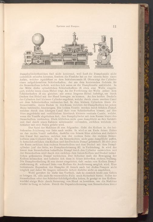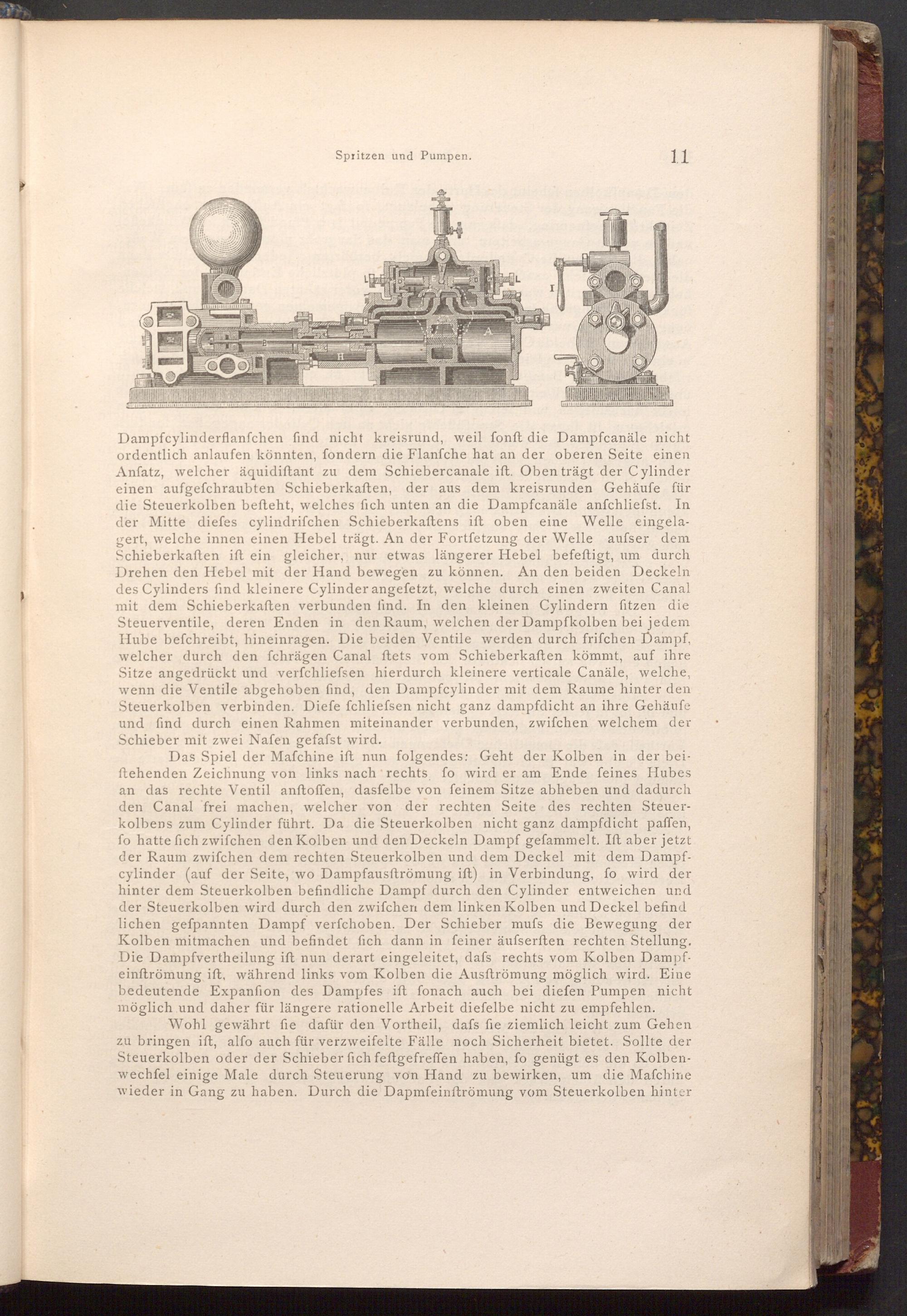 Das Spiel der Mafchine ift nun folgendes: Geht der Kolben in der beiftehenden Zeichnung von links nach rechts, fo wird er am Ende feines Hubes an das rechte Ventil anftoffen, dasfelbe von feinem Sitze abheben und dadurch den Canal frei machen, welcher von der rechten Seite des rechten Steuerkolbens zum Cylinder führt. Da die Steuerkolben nicht ganz dampfdicht paffen, fo hatte fich zwifchen den Kolben und den Deckeln Dampf gefammelt. Ift aber jetzt der Raum zwifchen dem rechten Steuerkolben und dem Deckel mit dem Dampfcylinder( auf der Seite, wo Dampfausftrömung ift) in Verbindung, fo wird der hinter dem Steuerkolben befindliche Dampf durch den Cylinder entweichen und der Steuerkolben wird durch den zwifchen dem linken Kolben und Deckel befind lichen gefpannten Dampf verfchoben. Der Schieber mufs die Bewegung der Kolben mitmachen und befindet fich dann in feiner äufserften rechten Stellung. Die Dampfvertheilung ift nun derart eingeleitet, dafs rechts vom Kolben Dampfeinftrömung ift, während links vom Kolben die Ausftrömung möglich wird. Eine bedeutende Expanfion des Dampfes ift fonach auch bei diefen Pumpen nicht möglich und daher für längere rationelle Arbeit diefelbe nicht zu empfehlen.