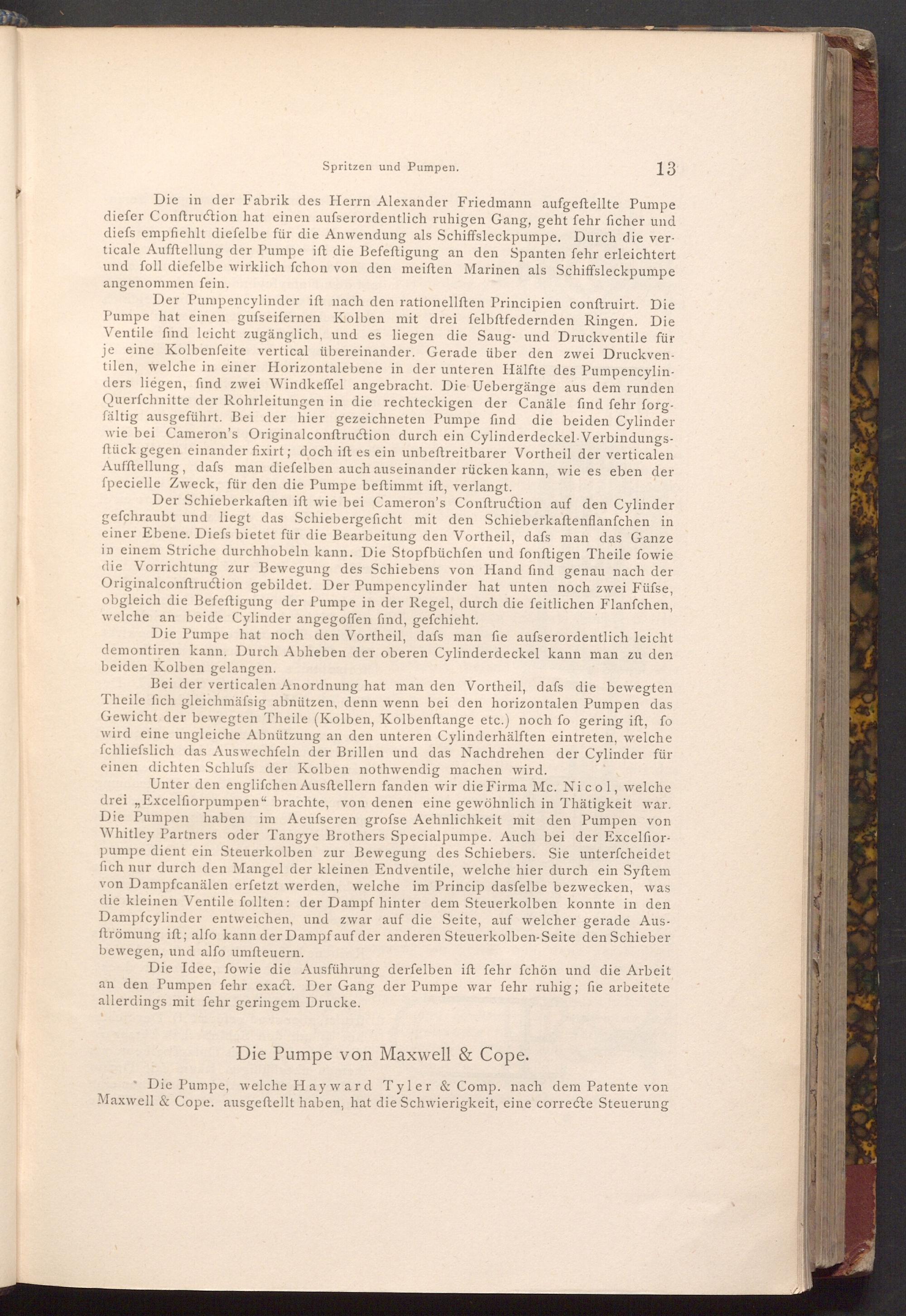 Die in der Fabrik des Herrn Alexander Friedmann aufgeftellte Pumpe diefer Conftruction hat einen aufserordentlich ruhigen Gang, geht fehr ficher und diefs empfiehlt diefelbe für die Anwendung als Schiffsleckpumpe. Durch die verticale Aufftellung der Pumpe ift die Befeftigung an den Spanten fehr erleichtert und foll diefelbe wirklich fchon von den meiften Marinen als Schiffsleckpumpe angenommen fein.