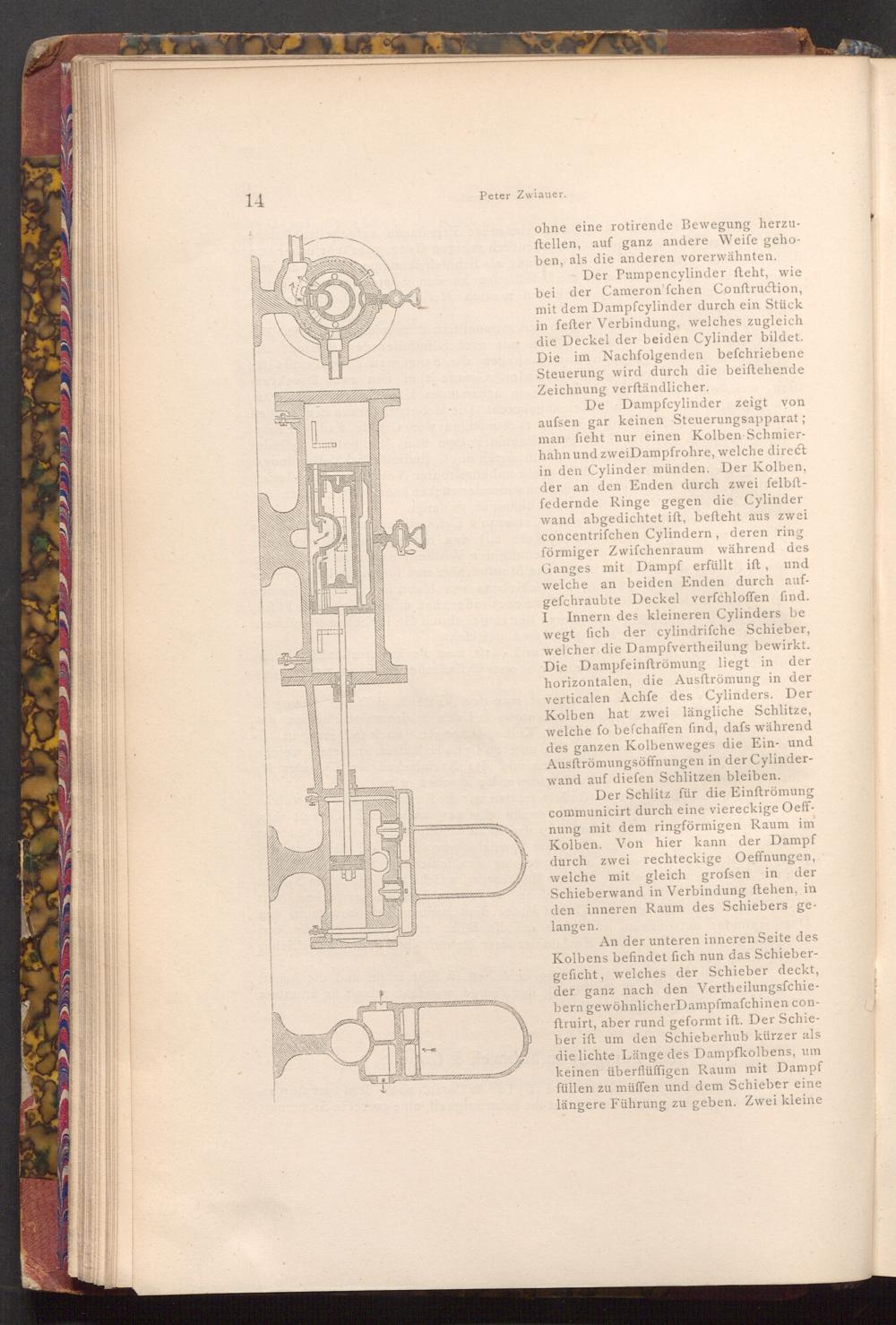 Der Pumpen cylinder fteht, wie bei der Cameron'fchen Conftruction, mit dem Dampfcylinder durch ein Stück in fefter Verbindung, welches zugleich die Deckel der beiden Cylinder bildet. Die im Nachfolgenden befchriebene Steuerung wird durch die beiftehende Zeichnung verftändlicher.