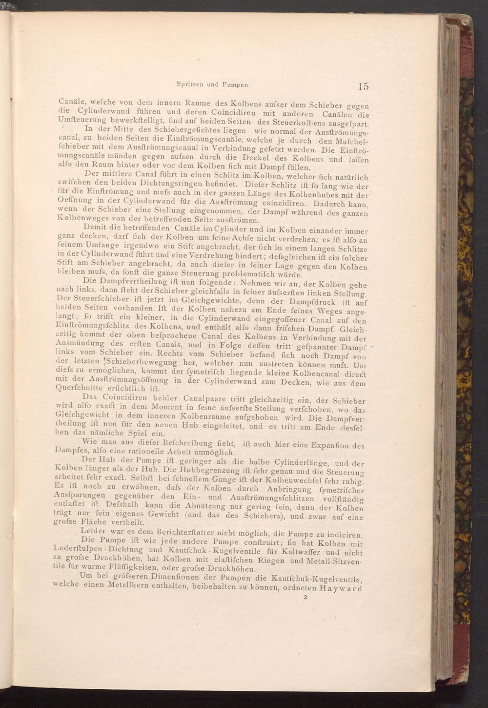 Leider war es dem Berichterstatter nicht möglich, die Pumpe zu indiciren. Die Pumpe ift wie jede andere Pumpe conftruirt; fie hat Kolben mit Lederftulpen Dichtung und Kautfchuk- Kugelventile für Kaltwaffer und nicht zu grofse Druckhöhen, hat Kolben mit elaftifchen Ringen und Metall- Sitzventile für warme Flüffigkeiten, oder grofse Druckhöhen.