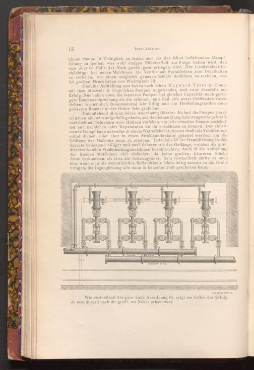 Diefelbe Aufftellung nun haben auch fchon Hayward Tyler& Comp. mit dem Maxwell& Cope'fchen Pumpen angewendet, und zwar ebenfalls mit Erfolg. Nur haben eben die letzteren Pumpen bei gleicher Capacität noch geringere Raumbeanfpruchung als die erfteren, und find alfo unter Umständen vorzuziehen, wo nämlich Brennmaterial fehr billig und die Herftellungskoften eines gröfseren Raumes in der Grube fehr grofs find.