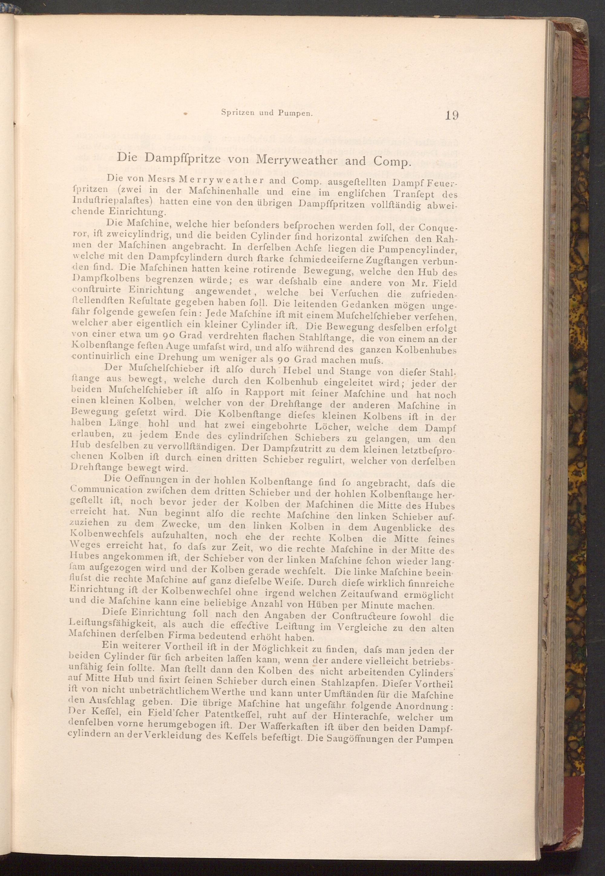 Die von Mesrs Merryweather and Comp. ausgeftellten Dampf Feuerfpritzen( zwei in der Mafchinenhalle und eine im englifchen Tranfept des Induftriepalaftes) hatten eine von den übrigen Dampffpritzen vollſtändig abweichende Einrichtung.