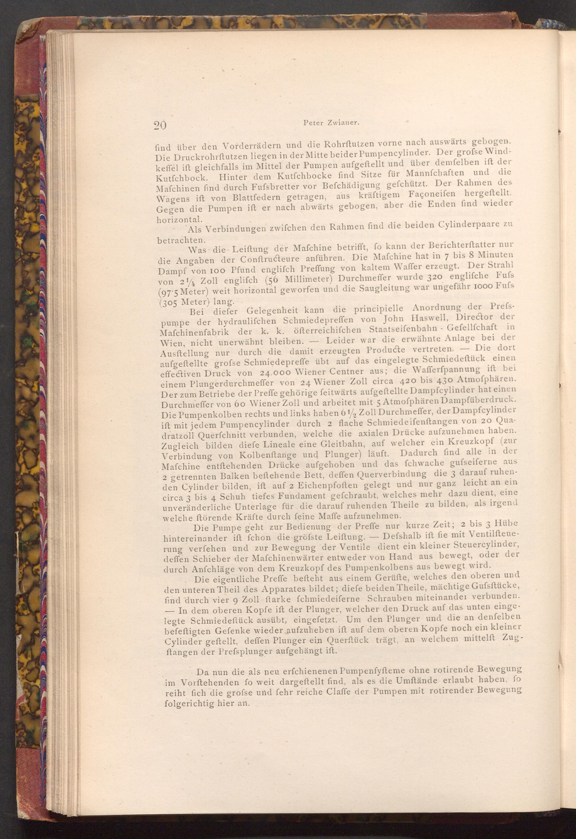Bei diefer Gelegenheit kann die principielle Anordnung der Prefspumpe der hydraulifchen Schmiedepreffen von John Haswell, Director der Mafchinenfabrik der k. k. öfterreichifchen Staatseifenbahn Gefellſchaft in Wien, nicht unerwähnt bleiben. Leider war die erwähnte Anlage bei der Ausftellung nur durch die damit erzeugten Producte vertreten.- Die dort aufgeftellte grofse Schmiedepreffe übt auf das eingelegte Schmiedeftück einen effectiven Druck von 24.000 Wiener Centner aus; die Wafferfpannung ift bei einem Plungerdurchmeffer von 24 Wiener Zoll circa 420 bis 430 Atmoſphären. Der zum Betriebe der Preffe gehörige feitwärts aufgeftellte Dampfcylinder hat einen Durchmeffer von 60 Wiener Zoll und arbeitet mit 5 Atmoſphären Dampfüberdruck. Die Pumpenkolben rechts und links haben 61, Zoll Durchmeffer, der Dampfcylinder ift mit jedem Pumpencylinder durch 2 flache Schmiedeifenftangen von 20 Quadratzoll Querfchnitt verbunden, welche die axialen Drücke aufzunehmen haben. Zugleich bilden diefe Lineale eine Gleitbahn, auf welcher ein Kreuzkopf( zur Verbindung von Kolbenftange und Plunger) läuft. Dadurch find alle in der Mafchine entſtehenden Drücke aufgehoben und das fchwache gufseiferne aus 2 getrennten Balken beftehende Bett, deffen Querverbindung die 3 darauf ruhenden Cylinder bilden, ift auf 2 Eichenpfoften gelegt und nur ganz leicht an ein circa 3 bis 4 Schuh tiefes Fundament gefchraubt, welches mehr dazu dient, eine unveränderliche Unterlage für die darauf ruhenden Theile zu bilden, als irgend welche ftörende Kräfte durch feine Maffe aufzunehmen.