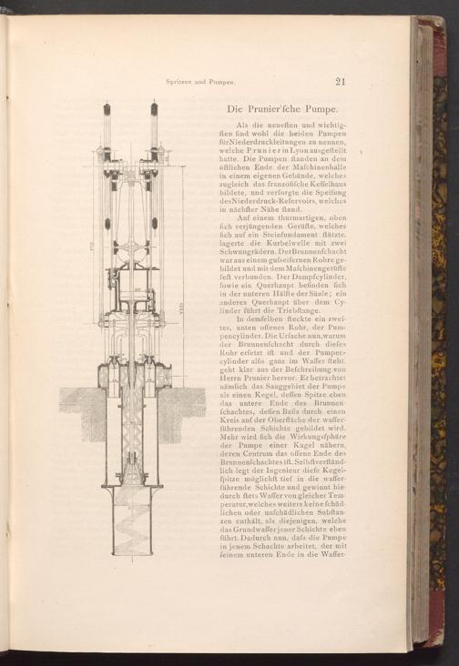 In demfelben fteckte ein zweites, unten offenes Rohr, der Pumpencylinder. Die Urfache nun, warum der Brunnenfchacht durch diefes Rohr erfetzt ift und der Pumpencylinder alfo ganz im Waffer fteht, geht klar aus der Befchreibung von Herrn Prunier hervor. Er betrachtet nämlich das Sauggebiet der Pumpe als einen Kegel, deffen Spitze eben das untere Ende des Brunnenfchachtes, deffen Bafis durch einen Kreis auf der Oberfläche der wafferführenden Schichte gebildet wird. Mehr wird fich die Wirkungsfphäre der Pumpe einer Kugel nähern, deren Centrum das offene Ende des Brunnenfchachtes ift. Selbftverftändlich legt der Ingenieur diefe Kegelfpitze möglichft tief in die wafferführende Schichte und gewinnt hiedurch ftets Waffer von gleicher Temperatur, welches weiters keine fchädlichen oder unfchädlichen Subftanzen enthält, als diejenigen, welche das Grundwafferjener Schichte eben führt. Dadurch nun, dafs die Pumpe in jenem Schachte arbeitet, der mit feinem unteren Ende in die Waffer.