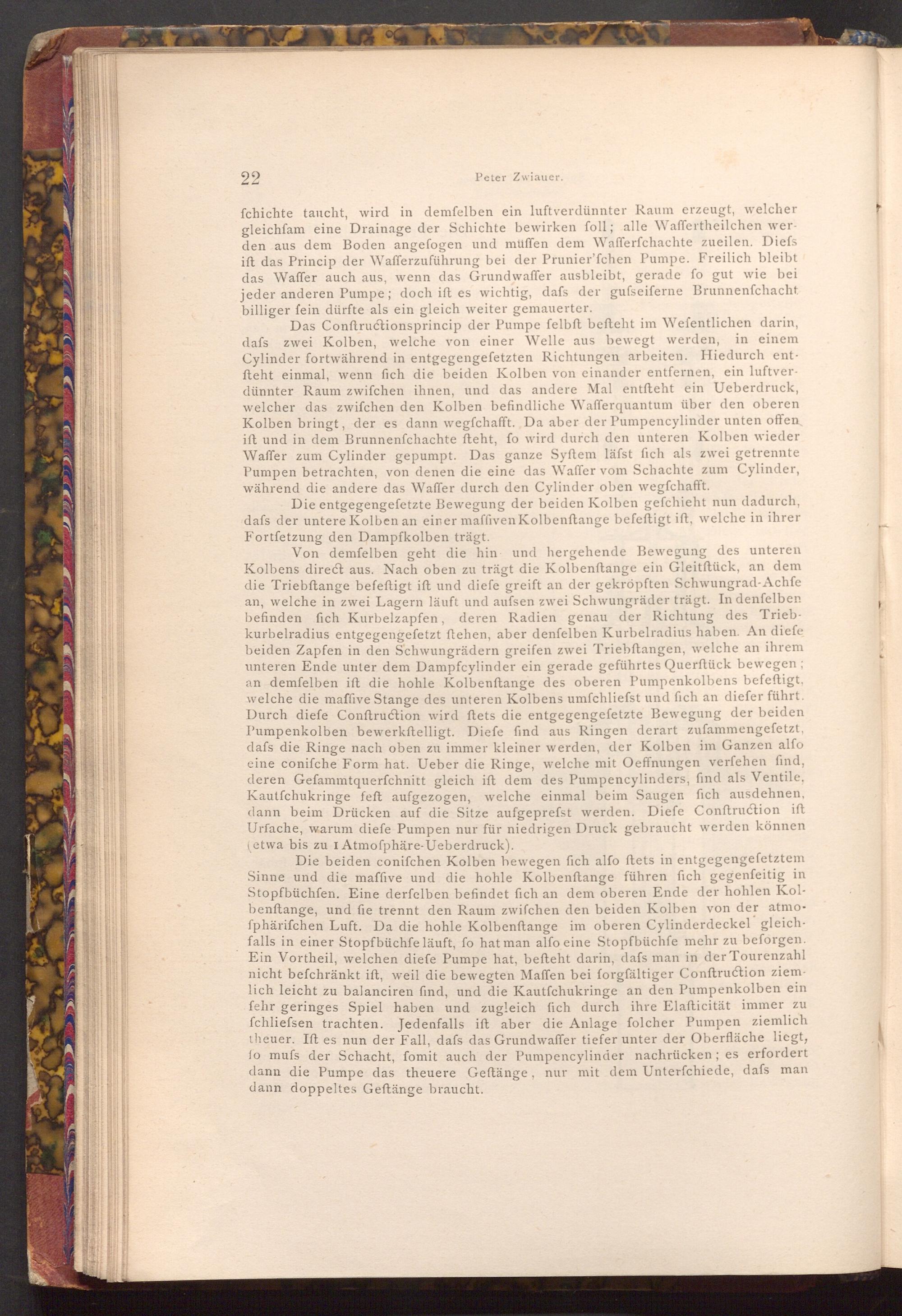 Das Conftructionsprincip der Pumpe felbft befteht im Wefentlichen darin, dafs zwei Kolben, welche von einer Welle aus bewegt werden, in einem Cylinder fortwährend in entgegengefetzten Richtungen arbeiten. Hiedurch entfteht einmal, wenn fich die beiden Kolben von einander entfernen, ein luftverdünnter Raum zwifchen ihnen, und das andere Mal entſteht ein Ueberdruck, welcher das zwifchen den Kolben befindliche Wafferquantum über den oberen Kolben bringt, der es dann wegfchafft. Da aber der Pumpencylinder unten offen ift und in dem Brunnenfchachte fteht, fo wird durch den unteren Kolben wieder Waffer zum Cylinder gepumpt. Das ganze Syftem läfst fich als zwei getrennte Pumpen betrachten, von denen die eine das Waffer vom Schachte zum Cylinder, während die andere das Waffer durch den Cylinder oben wegfchafft.