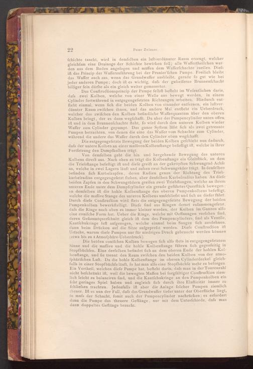 Die beiden conifchen Kolben bewegen fich alfo ftets in entgegengesetztem Sinne und die maffive und die hohle Kolbenftange führen fich gegenfeitig in Stopfbüchfen. Eine derfelben befindet fich an dem oberen Ende der hohlen Kolbenftange, und fie trennt den Raum zwifchen den beiden Kolben von der atmoſphärifchen Luft. Da die hohle Kolbenftange im oberen Cylinderdeckel gleichfalls in einer Stopfbüchfe läuft, fo hat man alfo eine Stopfbüchfe mehr zu beforgen. Ein Vortheil, welchen diefe Pumpe hat, befteht darin, dafs man in der Tourenzahl nicht befchränkt ift, weil die bewegten Maffen bei forgfältiger Conftruction ziem lich leicht zu balanciren find, und die Kautfchukringe an den Pumpenkolben ein fehr geringes Spiel haben und zugleich fich durch ihre Elafticität immer zu fchliefsen trachten. Jedenfalls ift aber die Anlage folcher Pumpen ziemlich theuer. Ift es nun der Fall, dafs das Grundwaffer tiefer unter der Oberfläche liegt, fo mufs der Schacht, fomit auch der Pumpencylinder nachrücken; es erfordert dann die Pumpe das theuere Geftänge, nur mit dem Unterfchiede, dafs man dann doppeltes Geftänge braucht.