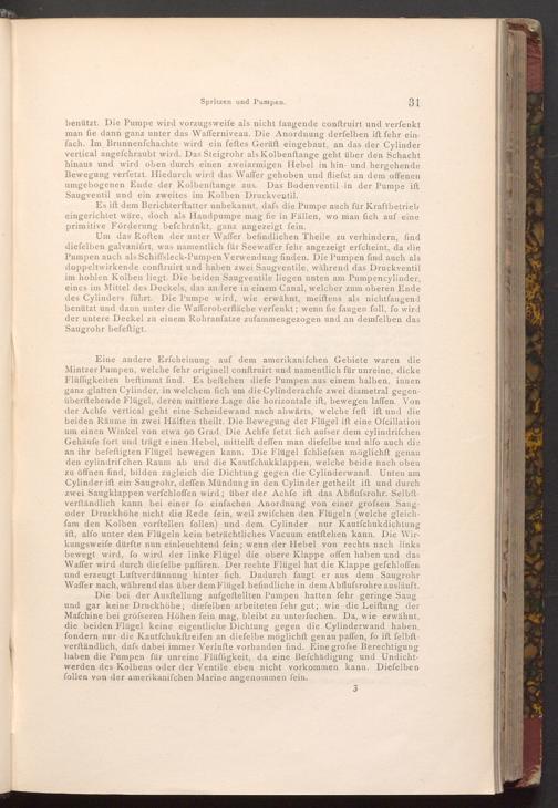 Eine andere Erfcheinung auf dem amerikanifchen Gebiete waren die Mintzer Pumpen, welche fehr originell conftruirt und namentlich für unreine, dicke Flüffigkeiten beftimmt find. Es beftehen diefe Pumpen aus einem halben, innen ganz glatten Cylinder, in welchem fich um die Cylinderachfe zwei diametral gegenüberftehende Flügel, deren mittlere Lage die horizontale ift, bewegen laffen. Von der Achfe vertical geht eine Scheidewand nach abwärts, welche feft ift und die beiden Räume in zwei Hälften theilt. Die Bewegung der Flügel ift eine Ofcillation um einen Winkel von etwa 90 Grad. Die Achfe fetzt fich aufser dem cylindrifchen Gehäufe fort und trägt einen Hebel, mittelft deffen man diefelbe und alfo auch die an ihr befeftigten Flügel bewegen kann. Die Flügel fchliefsen möglichft genau den cylindrif chen Raum ab und die Kautfchukklappen, welche beide nach oben zu öffnen find, bilden zugleich die Dichtung gegen die Cylinderwand. Unten am Cylinder ift ein Saugrohr, deffen Mündung in den Cylinder getheilt ift und durch zwei Saugklappen verfchloffen wird; über der Achfe ift das Abflufsrohr. Selbftverftändlich kann bei einer fo einfachen Anordnung von einer grofsen Saugoder Druckhöhe nicht die Rede fein, weil zwifchen den Flügeln( welche gleichfam den Kolben vorftellen follen) und dem Cylinder nur Kautfchukdichtung ift, alfo unter den Flügeln kein beträchtliches Vacuum entſtehen kann. Die Wirkungsweife dürfte nun einleuchtend fein; wenn der Hebel von rechts nach links bewegt wird, fo wird der linke Flügel die obere Klappe offen haben und das Waffer wird durch diefelbe paffiren. Der rechte Flügel hat die Klappe gefchloffen und erzeugt Luftverdünnung hinter fich. Dadurch faugt er aus dem Saugrohr Waffer nach, während das über dem Flügel befindliche in dem Abflufsrohre ausläuft. Die bei der Ausftellung aufgeftellten Pumpen hatten fehr geringe Saug und gar keine Druckhöhe; diefelben arbeiteten fehr gut; wie die Leiftung der Mafchine bei gröfseren Höhen fein mag, bleibt zu unterfuchen. Da, wie erwähnt, die beiden Flügel keine eigentliche Dichtung gegen die Cylinderwand haben, fondern nur die Kautfchukftreifen an diefelbe möglichft genau paffen, fo ift felbft. verftändlich, dafs dabei immer Verlufte vorhanden find. Eine grofse Berechtigung haben die Pumpen für unreine Flüffigkeit, da eine Befchädigung und Undichtwerden des Kolbens oder der Ventile eben nicht vorkommen kann. Diefelben follen von der amerikanifchen Marine angenommen fein.