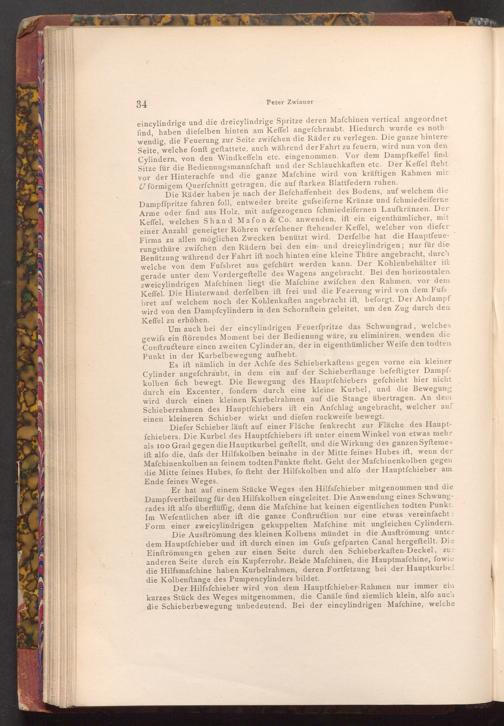 Die Räder haben je nach der Befchaffenheit des Bodens, auf welchem die Dampffpritze fahren foll, entweder breite gufseiferne Kränze und fchmiedeiferne Arme oder find aus Holz, mit aufgezogenen fchmiedeifernen Laufkränzen. Der Keffel, welchen Shand Mafon& Co. anwenden, ift ein eigenthümlicher, mit einer Anzahl geneigter Röhren verfehener ftehender Keffel, welcher von diefer Firma zu allen möglichen Zwecken benützt wird. Derfelbe hat die Hauptfeuerungsthüre zwifchen den Rädern bei den ein- und dreicylindrigen; nur für die Benützung während der Fahrt ift noch hinten eine kleine Thüre angebracht, durch welche von dem Fufsbret aus gefchürt werden kann. Der Kohlenbehälter ift gerade unter dem Vordergeftelle des Wagens angebracht. Bei den horizontalen. zweicylindrigen Mafchinen liegt die Mafchine zwifchen den Rahmen, vor dem Keffel. Die Hinterwand derfelben ift frei und die Feuerung wird von dem Fufs bret auf welchem noch der Kohlenkaften angebracht ift, beforgt. Der Abdampf wird von den Dampfcylindern in den Schornftein geleitet, um den Zug durch den Keffel zu erhöhen.