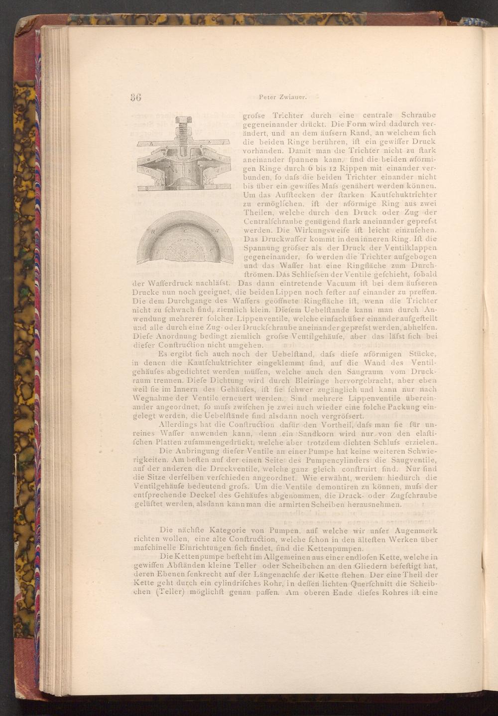 Die Kettenpumpe beſteht im Allgemeinen aus einer endlofen Kette, welche in gewiffen Abftänden kleine Teller oder Scheibchen an den Gliedern befeftigt hat, deren Ebenen fenkrecht auf der Längenachfe der Kette ftehen. Der eine Theil der Kette geht durch ein cylindrifches Rohr, in deffen lichten Querfchnitt die Scheibchen( Teller) möglichft genau paffen. Am oberen Ende diefes Rohres ift eine