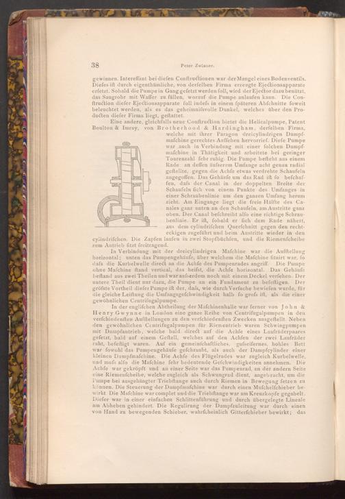 Eine andere, gleichfalls neue Conftruction bietet die Helicalpumpe, Patent Boulton& Imray, von Brotherhood& Hardingham, derfelben Firma, welche mit ihrer Paragon dreicylindrigen Dampfmafchine gerechtes Auffehen hervorrief. Diefe Pumpe war auch in Verbindung mit einer folchen Dampfmafchine in Thätigkeit und arbeitete bei geringer Tourenzahl fehr ruhig. Die Pumpe befteht aus einem Rade an deffen äufserem Umfange acht genau radial geftellte, gegen die Achfe etwas verdrehte Schaufeln angegoffen. Das Gehäufe um das Rad ift fo befchaffen, dafs der Canal in der doppelten Breite der Schaufeln fich von einem Punkte des Umfanges in einer Schraubenlinie um den ganzen Umfang herum zieht. Am Eingange liegt die freie Hälfte des Ca nales ganz unten an den Schaufeln, am Austritte ganz oben. Der Canal befchreibt alfo eine richtige Schraubenlinie. Er ift, fobald er fich dem Rade nähert, aus dem cylindrifchen Querfchnitt gegen den rechteckigen zugeführt und beim Austritte wieder in den cylindrifchen. Die Zapfen laufen in zwei Stopfbüchfen, und die Riemenfcheibe zum Antrieb fitzt freitragend.