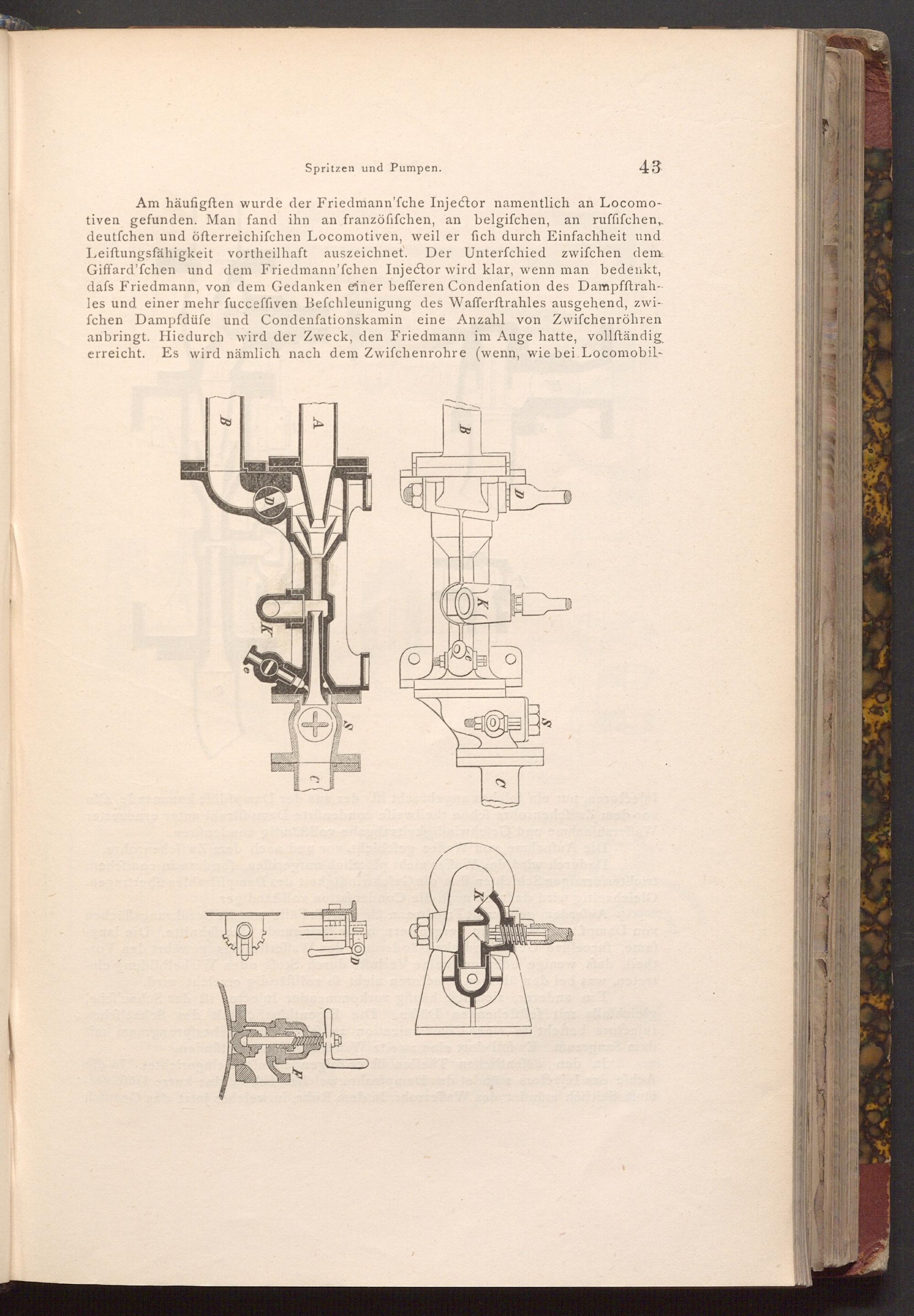 Am häufigften wurde der Friedmann'fche Injector namentlich an Locomotiven gefunden. Man fand ihn an franzöfifchen, an belgifchen, an ruffifchen, deutfchen und öfterreichifchen Locomotiven, weil er fich durch Einfachheit und. Leiftungsfähigkeit vortheilhaft auszeichnet. Der Unterfchied zwifchen dem Giffard'fchen und dem Friedmann'fchen Injector wird klar, wenn man bedenkt, dafs Friedmann, von dem Gedanken einer befferen Condenfation des Dampfftrahles und einer mehr fucceffiven Befchleunigung des Wafferftrahles ausgehend, zwifchen Dampfdüfe und Condenfationskamin eine Anzahl von Zwifchenröhren anbringt. Hiedurch wird der Zweck, den Friedmann im Auge hatte, vollſtändig erreicht. Es wird nämlich nach dem Zwifchenrohre( wenn, wie bei Locomobil