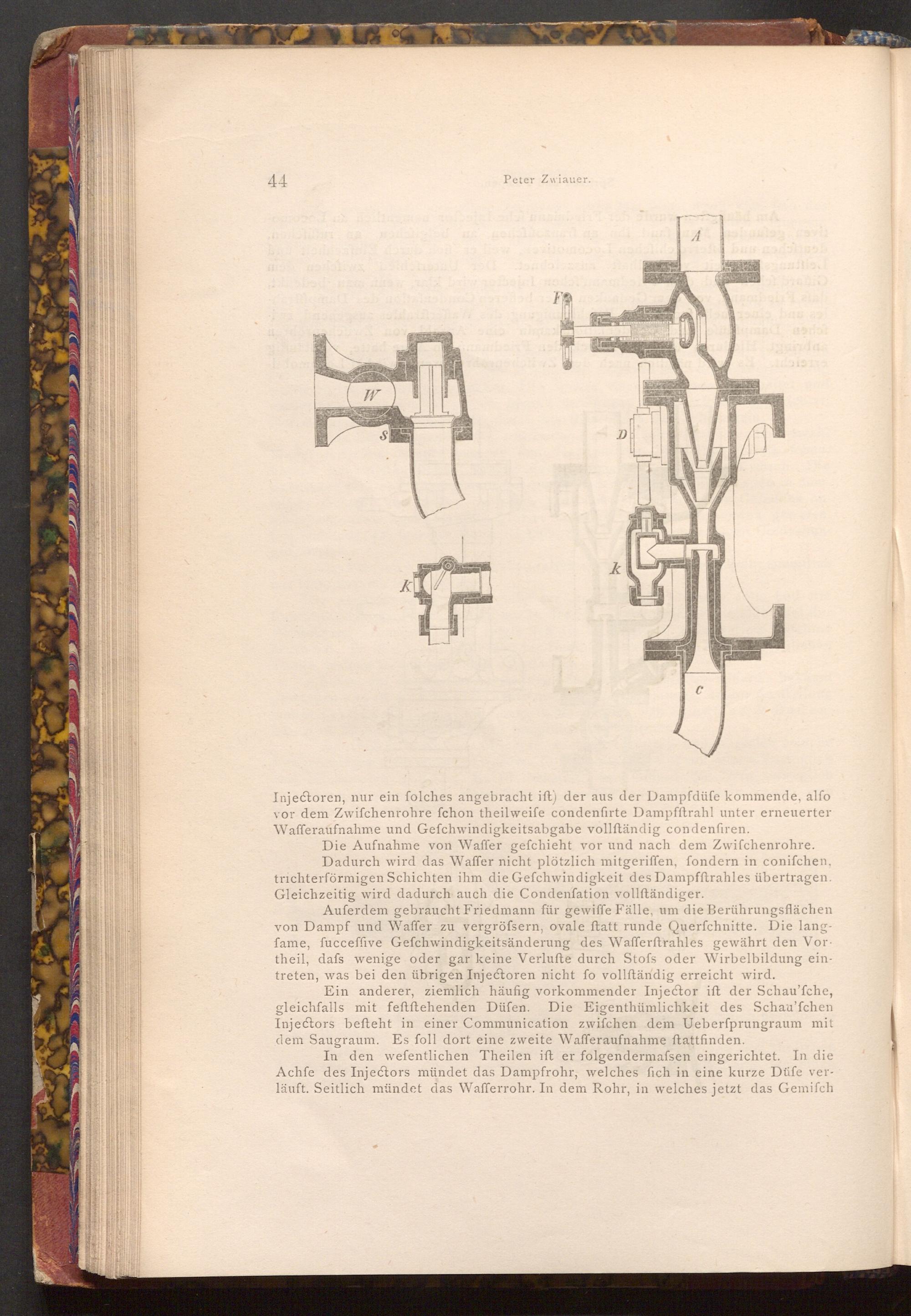 Ein anderer, ziemlich häufig vorkommender Injector ift der Schau'fche, gleichfalls mit feftftehenden Düfen. Die Eigenthümlichkeit des Schau'fchen Injectors befteht in einer Communication zwifchen dem Ueberfprungraum mit dem Saugraum. Es foll dort eine zweite Wafferaufnahme ftattfinden.