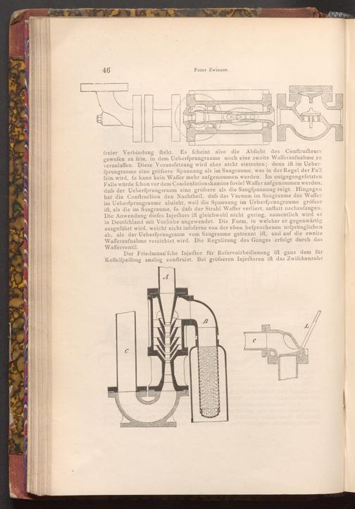 freier Verbindung fteht. Es fcheint also die Abficht des Conftructeurs gewefen zu fein, in dem Ueberfprungraume noch eine zweite Wafferaufnahme zu veranlaffen. Diese Vorausfetzung wird aber nicht eintreten; denn ist im Ueberfprungraume eine gröfsere Spannung als im Saugraume, was in der Regel der Fall fein wird, fo kann kein Waffer mehr aufgenommen werden. Im entgegengefetzten Falle würde fchon vor dem Condenfationskamine foviel Waffer aufgenommen werden, dafs der Ueberfprungsraum eine gröfsere als die Saugfpannung zeigt. Hingegen hat die Conftruction den Nachtheil, dafs das Vacuum im Saugraume das Waffer im Ueberfprungraume abzieht, weil die Spannung im Ueberfprungraume gröfser ift, als die im Saugraume, fo dafs der Strahl Waffer verliert, anftatt nachzufaugen. Die Anwendung diefes Injectors ift gleichwohl nicht gering, namentlich wird er in Deutfchland mit Vorliebe angewendet. Die Form, in welcher er gegenwärtig ausgeführt wird, weicht nicht infoferne von der eben befprochenen urfprünglichen ab, als der Ueberfprungraum vom Saugraume getrennt ift, und auf die zweite Wafferaufnahme verzichtet wird. Die Regulirung des Ganges erfolgt durch das Wafferventil.