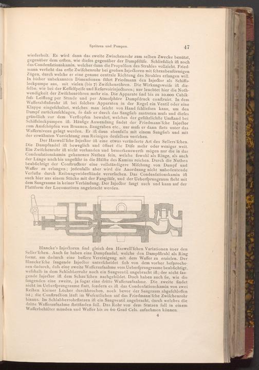 wiederholt. Es wird dann das zweite Zwischenrohr zum selben Zwecke benützt, gegenüber dem erften, wie diefes gegenüber der Dampfdüfe. Schliefslich ist noch das Condenfationskamin, welcher dann die Propulfion des Strahles vollzieht. Friedmann verfieht das erfte Zwifchenrohr bei grofsen Injectoren mit fchraubenförmigen Zügen, durch welche er eine genaue centrale Richtung des Strahles erlangen will. In bisher unbekannten Dimenfionen führt Friedmann den Injector als Schiffsleckpumpe aus, mit vielen( bis 7) Zwifchenröhren. Die Wirkungsweife ift diefelbe, wie bei der Keffelfpeife und Refervoirinjectoren; nur leuchtet hier die Nothwendigkeit der Zwifchenröhren mehr ein. Die Apparate find bis zu 10.000 Cubik. fufs Leiftung per Stunde und per Atmoſphäre Dampfdruck conftruirt. In dem Wafferabflufsrohr ift bei folchen Apparaten in der Regel ein Ventil oder eine Klappe eingefchaltet, welches man leicht von Hand fchliefsen kann, um den Dampf zurückzufchlagen, fo dafs er durch das Saugfieb austreten mufs und diefes gründlich vor dem Verftopfen bewahrt, welches der gefährlichfte Umftand bei Schiffsleckpumpen ift. Häufige Anwendung findet der Friedmann'fche Injector zum Ausfchöpfen von Brunnen, Baugruben etc., nur mufs er dann ftets unter das Wafferniveau gelegt werden. Er ift dann ebenfalls mit einem Saugfieb und mit der erwähnten Vorrichtung zum Reinigen desfelben verfehen.