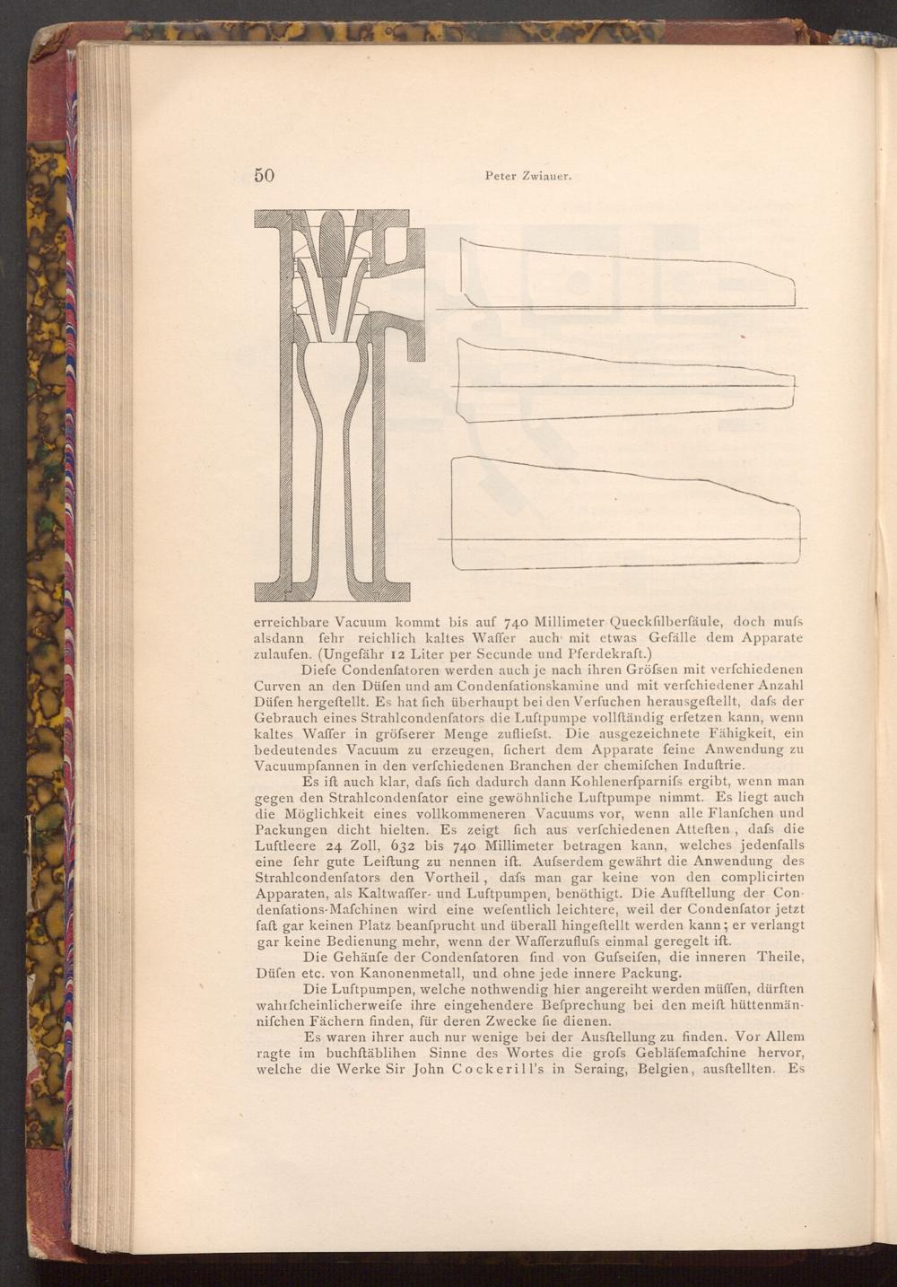 erreichbare Vacuum kommt bis auf 740 Millimeter Quecksilberfäule, doch mufs alsdann fehr reichlich kaltes Waffer auch mit etwas Gefälle dem Apparate zulaufen.( Ungefähr 12 Liter per Secunde und Pferdekraft.)