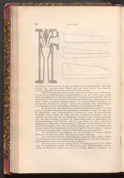 Diefe Condenfatoren werden auch je nach ihren Gröfsen mit verfchiedenen Curven an den Düfen und am Condenfationskamine und mit verfchiedener Anzahl Düfen hergestellt. Es hat fich überhaupt bei den Verfuchen herausgeftellt, dafs der Gebrauch eines Strahlcondenfators die Luftpumpe vollſtändig erfetzen kann, wenn kaltes Waffer in gröfserer Menge zufliefst. Die ausgezeichnete Fähigkeit, ein bedeutendes Vacuum zu erzeugen, fichert dem Apparate feine Anwendung zu Vacuumpfannen in den verfchiedenen Branchen der chemifchen Induſtrie.