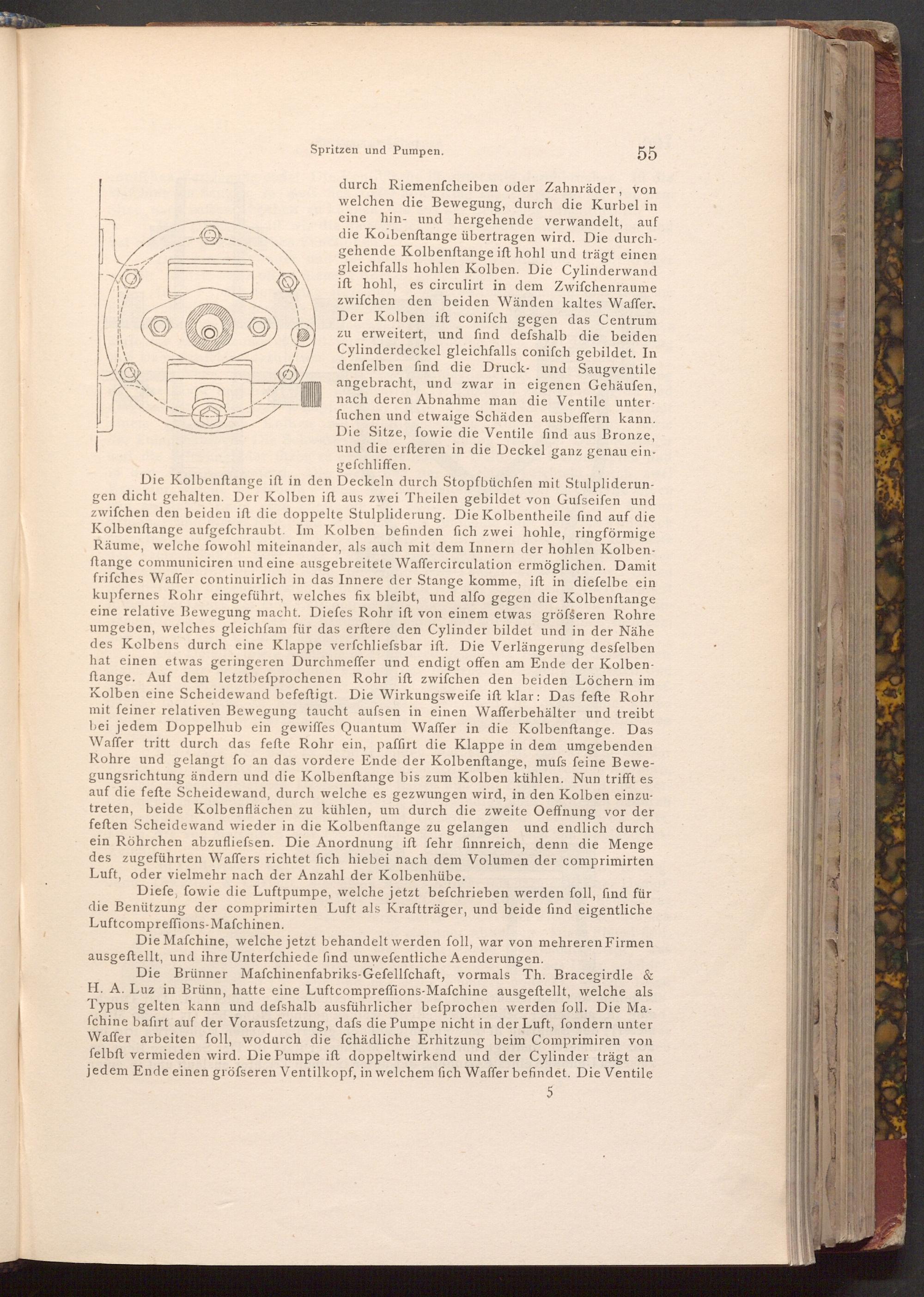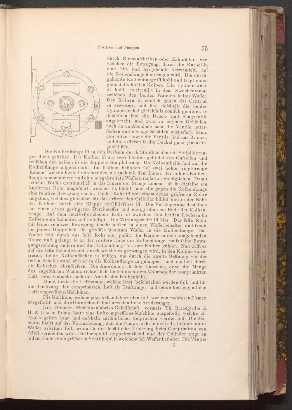 Die Brünner Mafchinenfabriks- Gefellſchaft, vormals Th. Bracegirdle& H. A. Luz in Brünn, hatte eine Luftcompreffions- Mafchine ausgeftellt, welche als Typus gelten kann und defshalb ausführlicher befprochen werden foll. Die Mafchine bafirt auf der Vorausfetzung, dafs die Pumpe nicht in der Luft, fondern unter Waffer arbeiten foll, wodurch die fchädliche Erhitzung beim Comprimiren von felbft vermieden wird. Die Pumpe ift doppeltwirkend und der Cylinder trägt an jedem Ende einen gröfseren Ventilkopf, in welchem fich Waffer befindet. Die Ventile