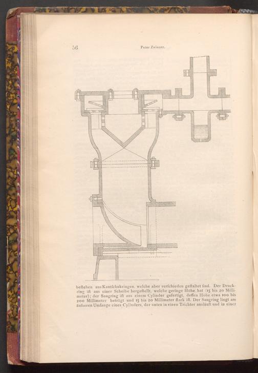 beftehen aus Kautfchukringen, welche aber verfchieden geftaltet find. Der Druck. ring ift aus einer Scheibe hergeftellt, welche geringe Höhe hat( 15 bis 20 Millimeter); der Saugring ift aus einem Cylinder gefertigt, deffen Höhe etwa 100 bis 200 Millimeter beträgt und 15 bis 20 Millimeter ftark ift. Der Saugring liegt am äufseren Umfange eines Cylinders, der unten in einen Trichter ausläuft und in einer