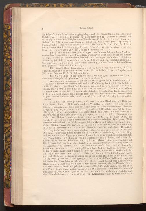 Die franzöfifchen Fabriken zu Cheffy, Lyon, Saint- Fons, L'Océran und Marennes confumirten im Jahre 1867 nach Schrötter's Angabe zwei Millionen Centner Kiefe für Schwefelsäure.