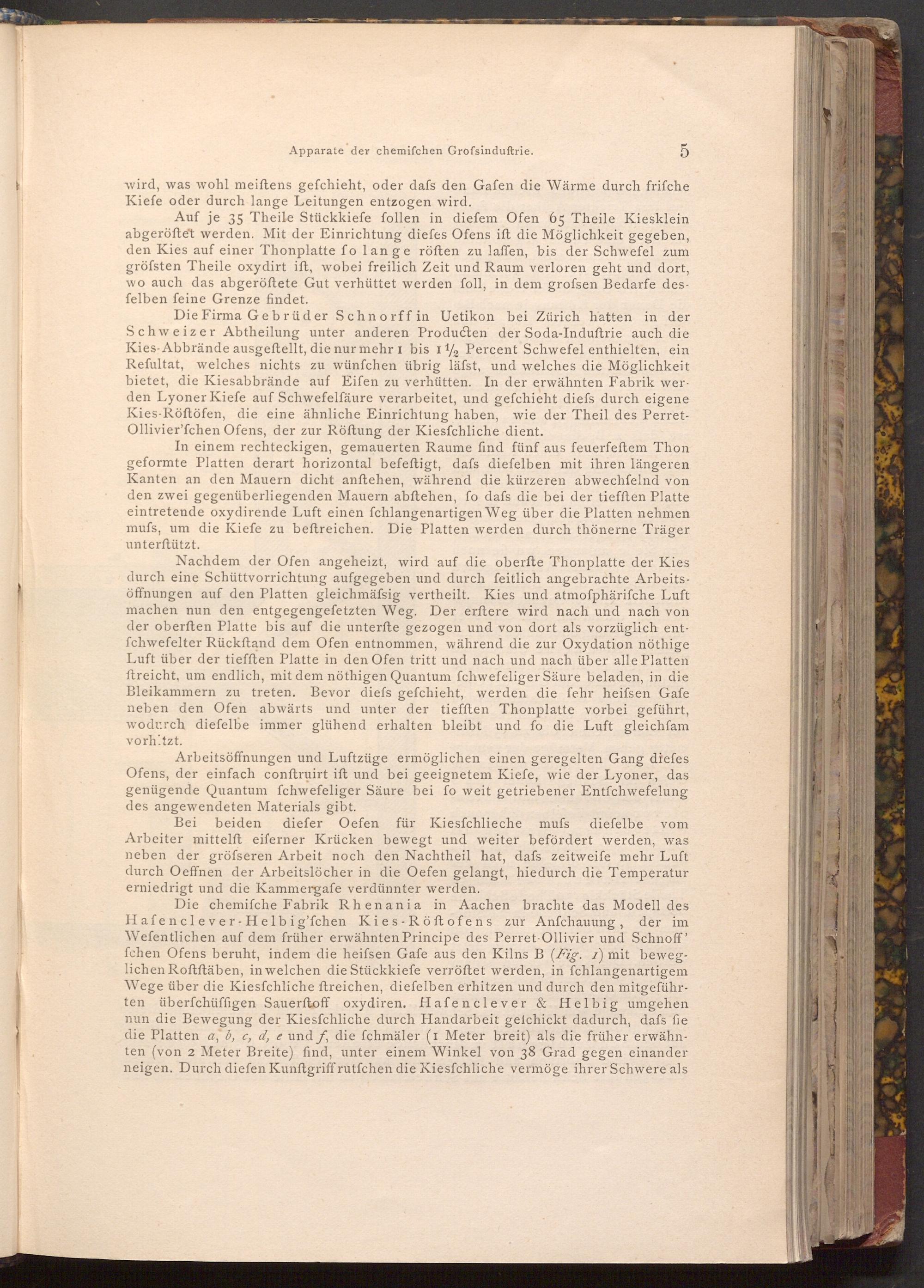 Die chemifche Fabrik Rhenania in Aachen brachte das Modell des Hafen clever Helbig'fchen Kies- Röftofens zur Anfchauung, der im Wefentlichen auf dem früher erwähnten Principe des Perret- Ollivier und Schnoff' fchen Ofens beruht, indem die heifsen Gafe aus den Kilns B( Fig. 1) mit beweglichen Roftftäben, in welchen die Stückkiefe verröftet werden, in fchlangenartigem Wege über die Kiesfchliche ftreichen, diefelben erhitzen und durch den mitgeführten überfchüffigen Sauerftoff oxydiren. Hafen clever& Helbig umgehen nun die Bewegung der Kiesfchliche durch Handarbeit geichickt dadurch, dafs fie die Platten a, b, c, d, e und f, die fchmäler( 1 Meter breit) als die früher erwähnten( von 2 Meter Breite) find, unter einem Winkel von 38 Grad gegen einander neigen. Durch diefen Kunftgriff rutfchen die Kiesfchliche vermöge ihrer Schwere als