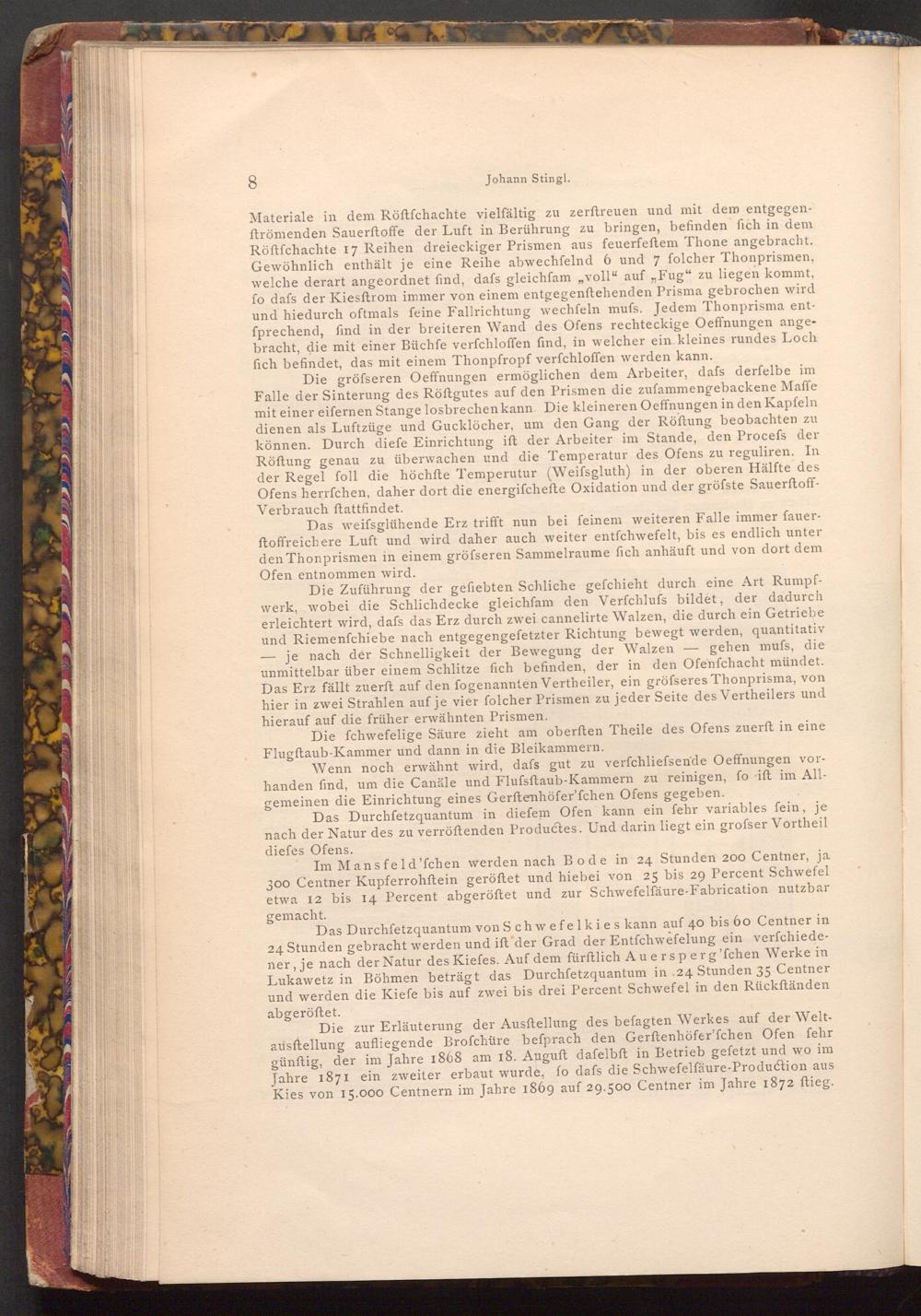 Die zur Erläuterung der Ausstellung des befagten Werkes auf der Weltausftellung aufliegende Brofchüre befprach den Gerftenhöfer'fchen Ofen fehr günftig, der im Jahre 1868 am 18. Auguft dafelbft in Betrieb gefetzt und wo im Jahre 1871 ein zweiter erbaut wurde, fo dafs die Schwefelfäure- Production aus Kies von 15.000 Centnern im Jahre 1869 auf 29.500 Centner im Jahre 1872 ftieg.