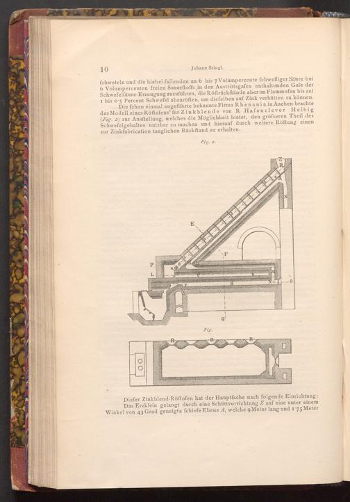 Diefer Zinkblend- Röftofen hat der Hauptfache nach folgende Einrichtung: Das Erzklein gelangt durch eine Schüttvorrichtung Z auf eine unter einem Winkel von 43 Grad geneigte fchiefe Ebene A, welche 9 Meter lang und 1.75 Meter