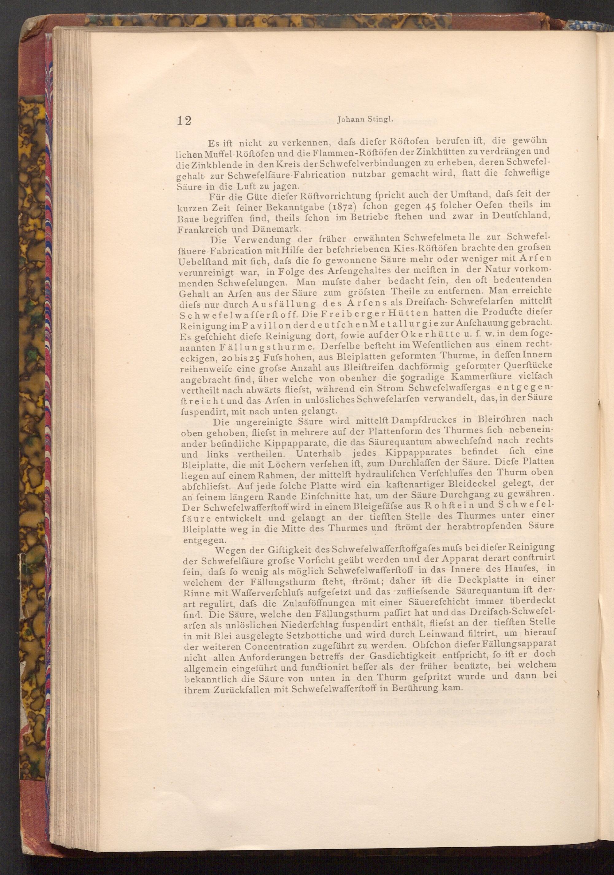 Die Verwendung der früher erwähnten Schwefelmeta lle zur Schwefelfäuere- Fabrication mit Hilfe der befchriebenen Kies- Röftöfen brachte den grofsen Uebelftand mit fich, dafs die fo gewonnene Säure mehr oder weniger mit Arfen verunreinigt war, in Folge des Arfengehaltes der meiften in der Natur vorkommenden Schwefelungen. Man musste daher bedacht fein, den oft bedeutenden Gehalt an Arfen aus der Säure zum gröfsten Theile zu entfernen. Man erreichte diefs nur durch Ausfällung des Arfens als Dreifach- Schwefelarfen mittelft Schwefelwafferft off. Die Freiberger Hütten hatten die Producte diefer Reinigung im Pavillon der deutfchen Metallurgie zur Anfchauung gebracht. Es gefchieht diefe Reinigung dort, fowie auf der Okerhütte u. f. w. in dem fogenannten Fällungsthurme. Derfelbe beſteht im Wefentlichen aus einem rechteckigen, 20 bis 25 Fufs hohen, aus Bleiplatten geformten Thurme, in deffen Innern reihenweife eine grofse Anzahl aus Bleiftreifen dachförmig geformter Querftücke angebracht find, über welche von obenher die 50gradige Kammerfäure vielfach vertheilt nach abwärts fliefst, während ein Strom Schwefelwaffergas entgegenftreicht und das Arfen in unlösliches Schwefelarfen verwandelt, das, in der Säure fuspendirt, mit nach unten gelangt.