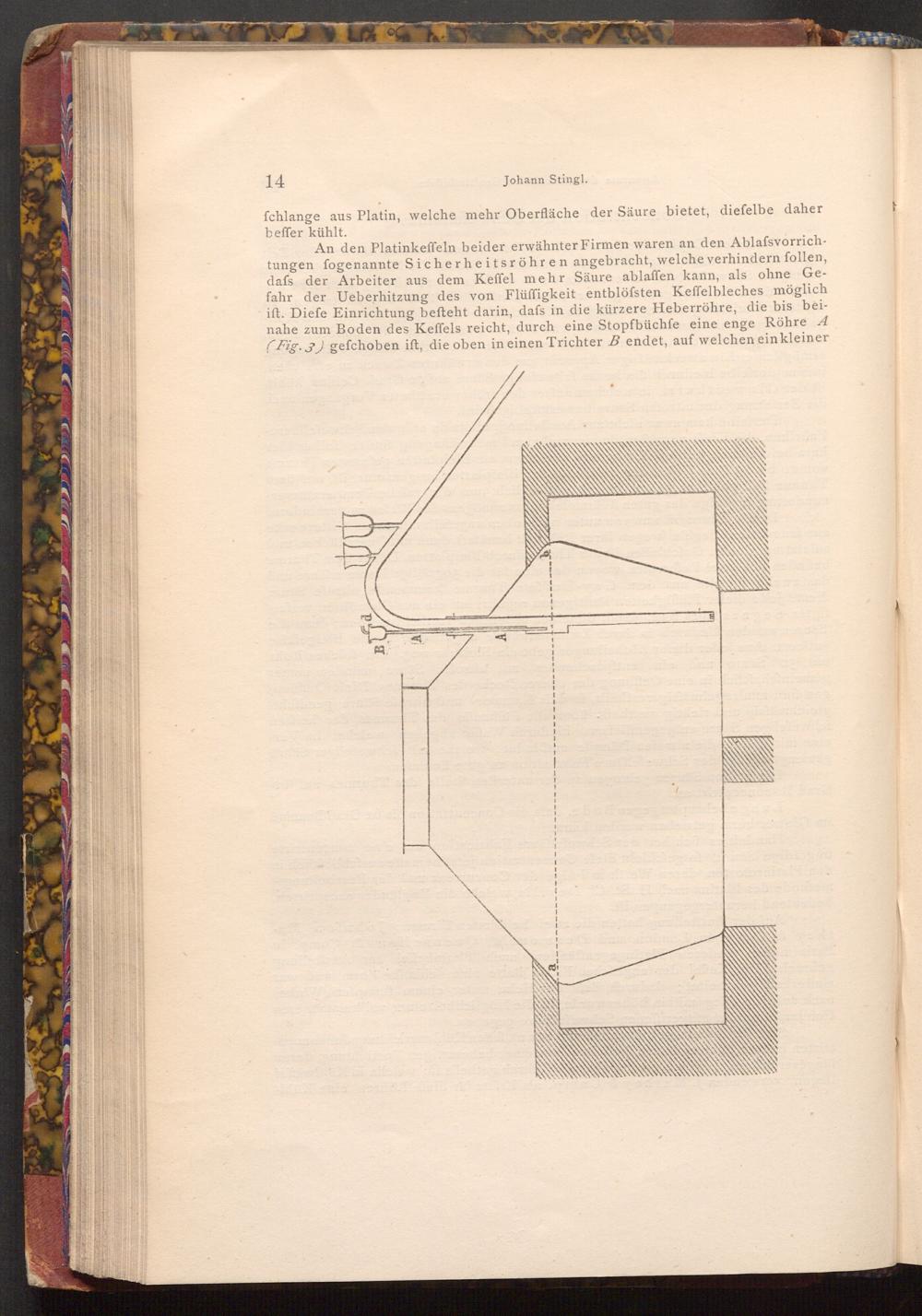 An den Platinkeffeln beider erwähnter Firmen waren an den Ablafsvorrichtungen fogenannte Sicherheitsröhren angebracht, welche verhindern follen, dafs der Arbeiter aus dem Keffel mehr Säure ablaffen kann, als ohne Gefahr der Ueberhitzung des von Flüffigkeit entblöfsten Keffelbleches möglich ift. Diefe Einrichtung befteht darin, dafs in die kürzere Heberröhre, die bis beinahe zum Boden des Keffels reicht, durch eine Stopfbüchfe eine enge Röhre A ( Fig. 3) gefchoben ift, die oben in einen Trichter B endet, auf welchen ein kleiner