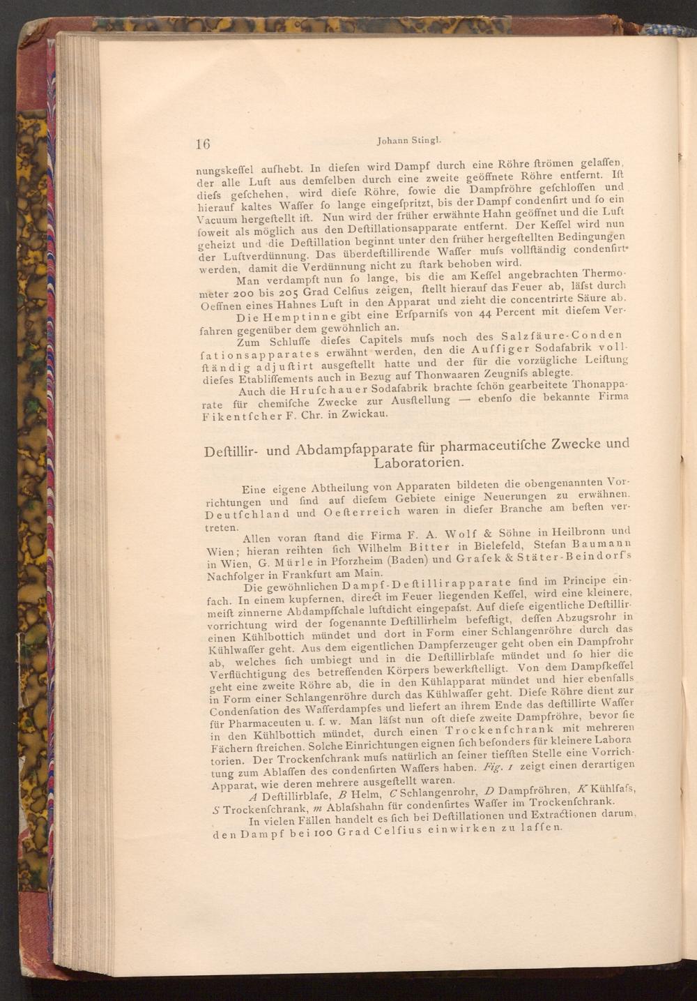 Die gewöhnlichen Dampf- Deftillirapparate find im Principe einfach. In einem kupfernen, direct im Feuer liegenden Keffel, wird eine kleinere, meift zinnerne Abdampffchale luftdicht eingepafst. Auf diefe eigentliche Deftillir. vorrichtung wird der fogenannte Deftillirhelm befeftigt, deffen Abzugsrohr in einen Kühlbottich mündet und dort in Form einer Schlangenröhre durch das Kühlwaffer geht. Aus dem eigentlichen Dampferzeuger geht oben ein Dampfrohr ab, welches fich umbiegt und in die Deftillirblafe mündet und fo hier die Verflüchtigung des betreffenden Körpers bewerkstelligt. Von dem Dampfkeffel geht eine zweite Röhre ab, die in den Kühlapparat mündet und hier ebenfalls in Form einer Schlangenröhre durch das Kühlwaffer geht. Diefe Röhre dient zur Condenſation des Wafferdampfes und liefert an ihrem Ende das deftillirte Waffer für Pharmaceuten u. f. w. Man läfst nun oft diefe zweite Dampfröhre, bevor fie in den Kühlbottich mündet, durch einen Trockenfchrank mit mehreren Fächern ftreichen. Solche Einrichtungen eignen fich befonders für kleinere Labora torien. Der Trockenfchrank mufs natürlich an feiner tiefften Stelle eine Vorrichtung zum Ablaffen des condenfirten Waffers haben. Fig. 1 zeigt einen derartigen Apparat, wie deren mehrere ausgeftellt waren.