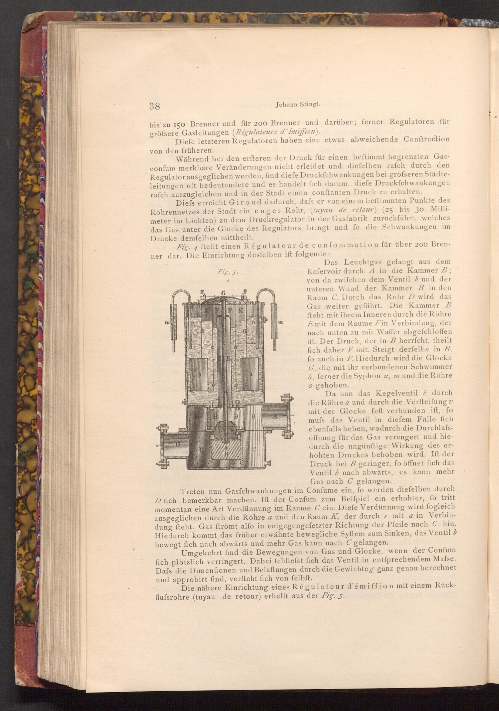 Das Leuchtgas gelangt aus dem Refervoir durch A in die Kammer B; von da zwifchen dem Ventil 6 und der unteren Wand der Kammer B in den Raum C. Durch das Rohr D wird das Gas weiter geführt. Die Kammer B fteht mit ihrem Inneren durch die Röhre Emit dem Raume Fin Verbindung, der nach unten zu mit Waffer abgefchloffen ift. Der Druck, der in B herrfcht, theilt fich daher F mit. Steigt derfelbe in B, fo auch in F. Hiedurch wird die Glocke G, die mit ihr verbundenen Schwimmer h, ferner die Syphon n, m und die Röhre o gehoben.