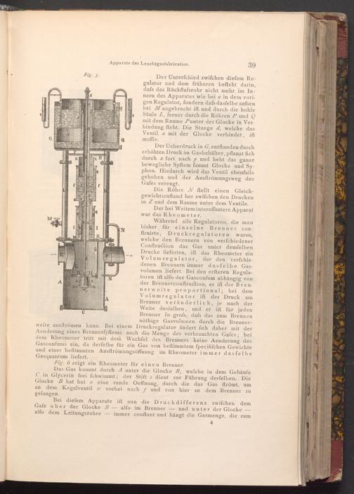 Während alle Regulatoren, die man bisher für einzelne Brenner ftruirte, Druckregulatoren welche den Brennern von verfchiedener Conftruction das Gas unter demfelben Drucke lieferten, ift das Rheometer ein Volum regulator, der den verfchiedenen Brennern immer dasfelbe Gasvolumen liefert. Bei den erfteren Regulatoren ift alfo der Gasconfum abhängig von der Brennerconftruction, er ift der Brennerweite proportional; bei dem Volumregulator ift der Druck am Brenner veränderlich, je nach der Weite desfelben, und er ist für jeden Brenner fo grofs, dafs das zum Brennen nöthige Gasvolumen durch die Brennerweite ausftrömen kann. Bei einem Druckregulator ändert fich daher mit der Aenderung eines Brennerfyftems auch die Menge des verbrauchten Gafes; bei dem Rheometer tritt mit dem Wechfel des Brenners keine Aenderung des Gasconfums ein, da derfelbe für ein Gas von beftimmtem fpecififchen Gewichte und einer beftimmten Ausftrömungsöffnung im Rheometer immer das felbe Gasquantum liefert.