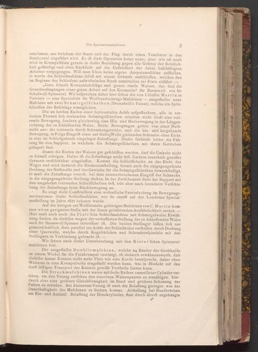 Die ausgeftellte Doublirmafchine, welche 24 Bänder der Grobkarde zu einem Wickel für die Feinkrempel vereinigt, ift dadurch erwähnenswerth, dafs diefelbe fammt Kannen nicht mehr Platz wie eine Karde beansprucht, daher ohne Weiteres in eine Krempelreihe eingeftellt werden kann, was in Hinficht auf den fonft läftigen Transport der Kannen gewiffe Vortheile bieten kann.