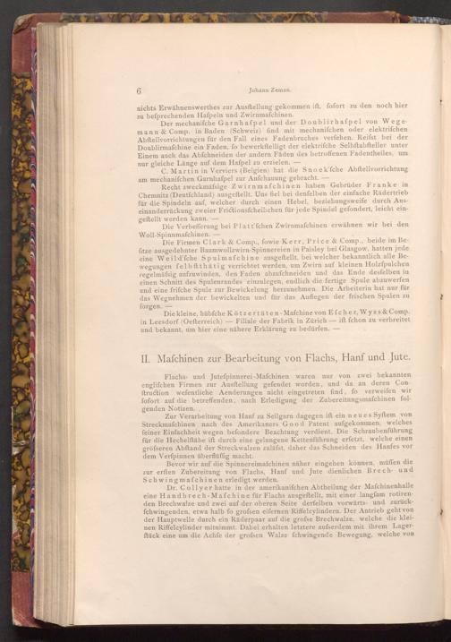 Flachs- und Jutefpinnerei-Mafchinen waren nur von zwei bekannten englifchen Firmen zur Ausftellung gefendet worden, und da an deren Conftruction wefentliche Aenderungen nicht eingetreten find, fo verweifen wir fofort auf die betreffenden, nach Erledigung der Zubereitungsmaschinen folgenden Notizen.,