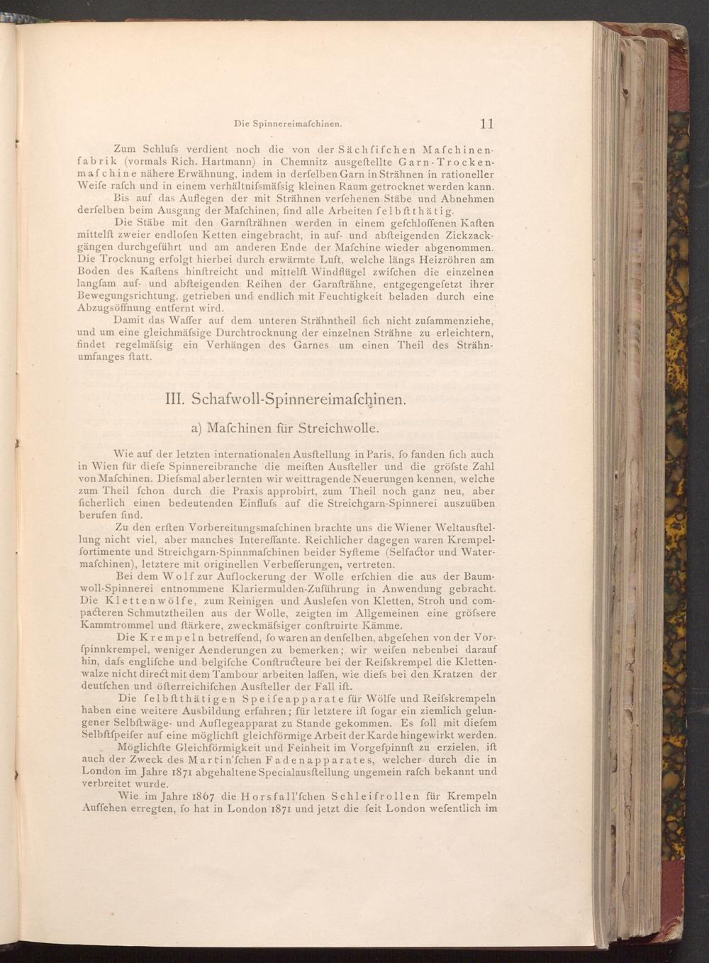 Wie auf der letzten internationalen Ausftellung in Paris, fo fanden fich auch in Wien für diefe Spinnereibranche die meiſten Ausfteller und die gröfste Zahl von Mafchinen. Diefsmal aber lernten wir weittragende Neuerungen kennen, welche zum Theil fchon durch die Praxis approbirt, zum Theil noch ganz neu, aber ficherlich einen bedeutenden Einfluss auf die Streichgarn- Spinnerei auszuüben berufen find.