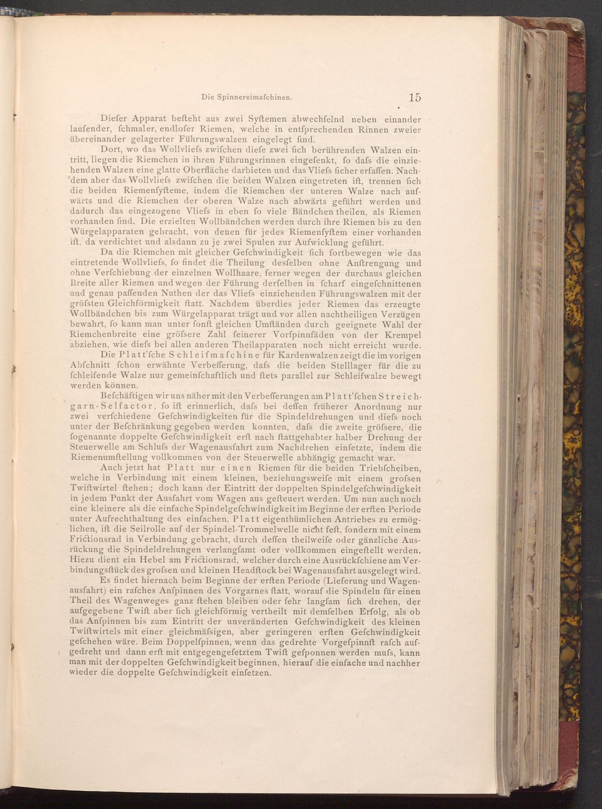 Da die Riemchen mit gleicher Gefchwindigkeit fich fortbewegen wie das eintretende Wollvliefs, fo findet die Theilung desfelben ohne Anftrengung und ohne Verfchiebung der einzelnen Wollhaare, ferner wegen der durchaus gleichen Breite aller Riemen und wegen der Führung derfelben in fcharf eingefchnittenen und genau paffenden Nuthen der das Vliefs einziehenden Führungswalzen mit der gröfsten Gleichförmigkeit ftatt. Nachdem überdies jeder Riemen das erzeugte Wollbändchen bis zum Würgelapparat trägt und vor allen nachtheiligen Verzügen bewahrt, fo kann man unter fonft gleichen Umftänden durch geeignete Wahl der Riemchenbreite eine gröfsere Zahl feinerer Vorfpinnfäden von der Krempel abziehen, wie diefs bei allen anderen Theilapparaten noch nicht erreicht wurde. Die Platt'fche Schleifmafchine für Kardenwalzen zeigt die im vorigen Abfchnitt fchon erwähnte Verbefferung, dafs die beiden Stelllager für die zu fchleifende Walze nur gemeinfchaftlich und ftets parallel zur Schleifwalze bewegt werden können.