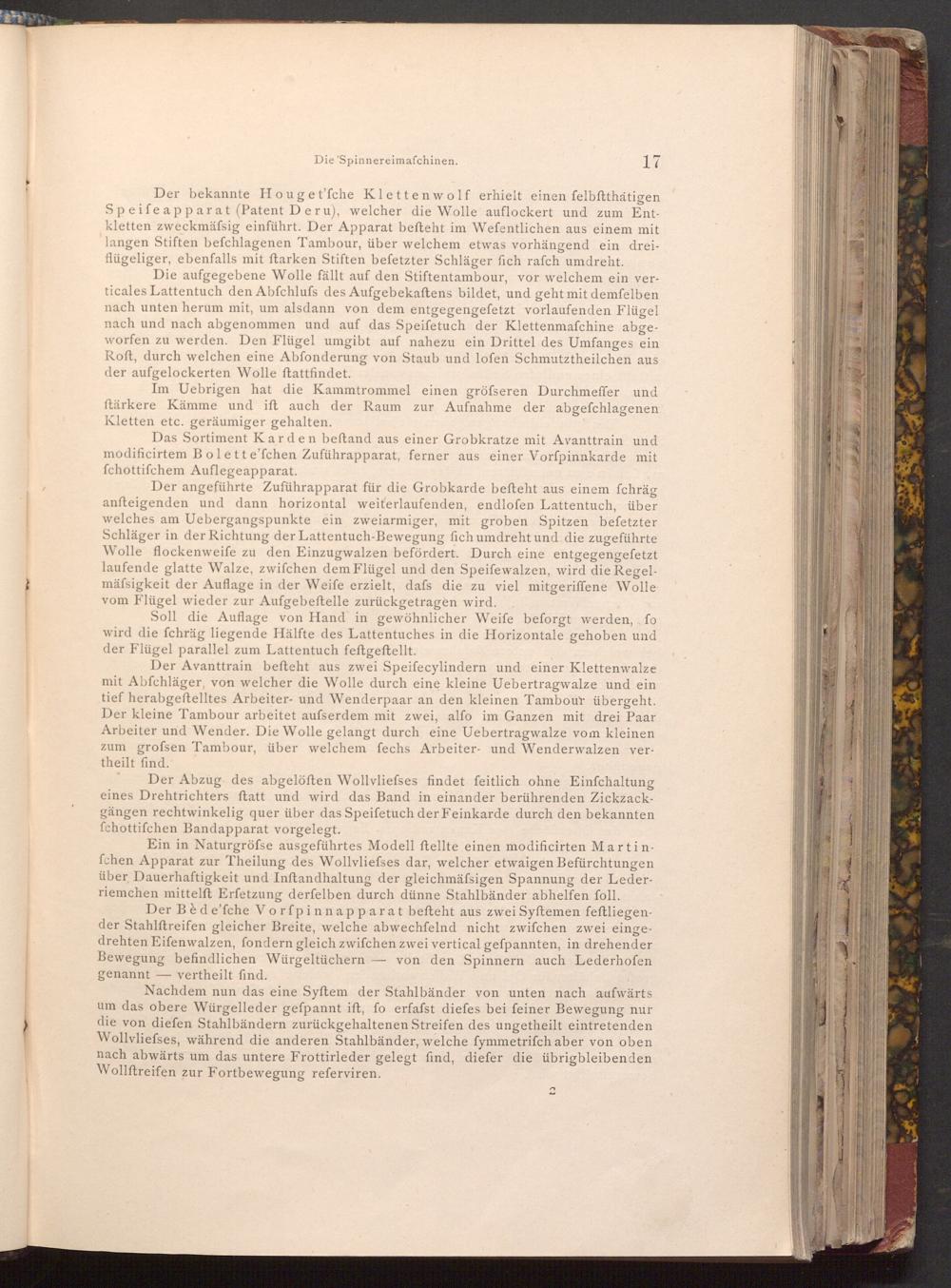 Das Sortiment Karden beftand aus einer Grobkratze mit Avanttrain und modificirtem Bolette'fchen Zuführapparat, ferner aus einer Vorfpinnkarde mit fchottifchem Auflegeapparat.