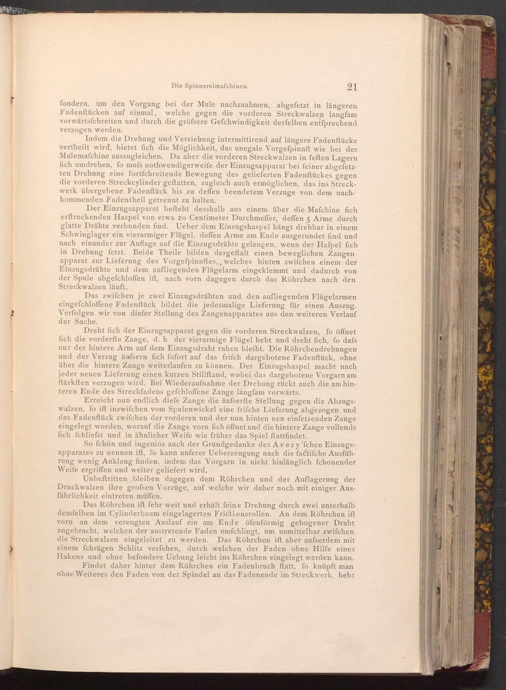 fondern, um den Vorgang bei der Mule nachzuahmen, abgefetzt in längeren Fadenftücken auf einmal, welche gegen die vorderen Streckwalzen langfam vorwärtsfchreiten und durch die gröfsere Gefchwindigkeit derfelben entfprechend verzogen werden.