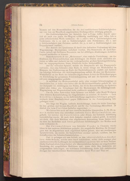 Bemerkenswerth ift der Moderateur", eine einfache Vorrichtung, um das Einfetzen der Frictionsfcheiben zum Abfchlagen der Fäden nicht allzurafch eintreten zu laffen und dadurch bei der vorhergehenden grofsen Spindelgefchwindigkeit, im entgegengefetzten Sinne, fchädliche Stöfse herbeizuführen.
