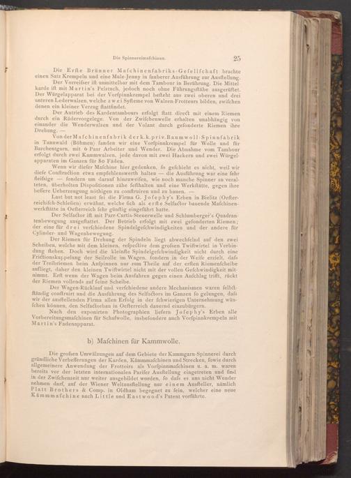 Die Erfte Brünner Mafchinenfabriks- Gefellfchaft brachte einen Satz Krempeln und eine Mule- Jenny in fauberer Ausführung zur Ausstellung. Der Vorreifser ift unmittelbar mit dem Tambour in Berührung. Die Mittelkarde ift mit Martin's Pelztuch, jedoch noch ohne Führungsftäbe ausgerüftet. Der Würgelapparat bei der Vorfpinnkrempel befteht aus zwei oberen und drei unteren Lederwalzen, welche zwei Syfteme von Walzen- Frotteurs bilden, zwifchen denen ein kleiner Verzug ftattfindet.