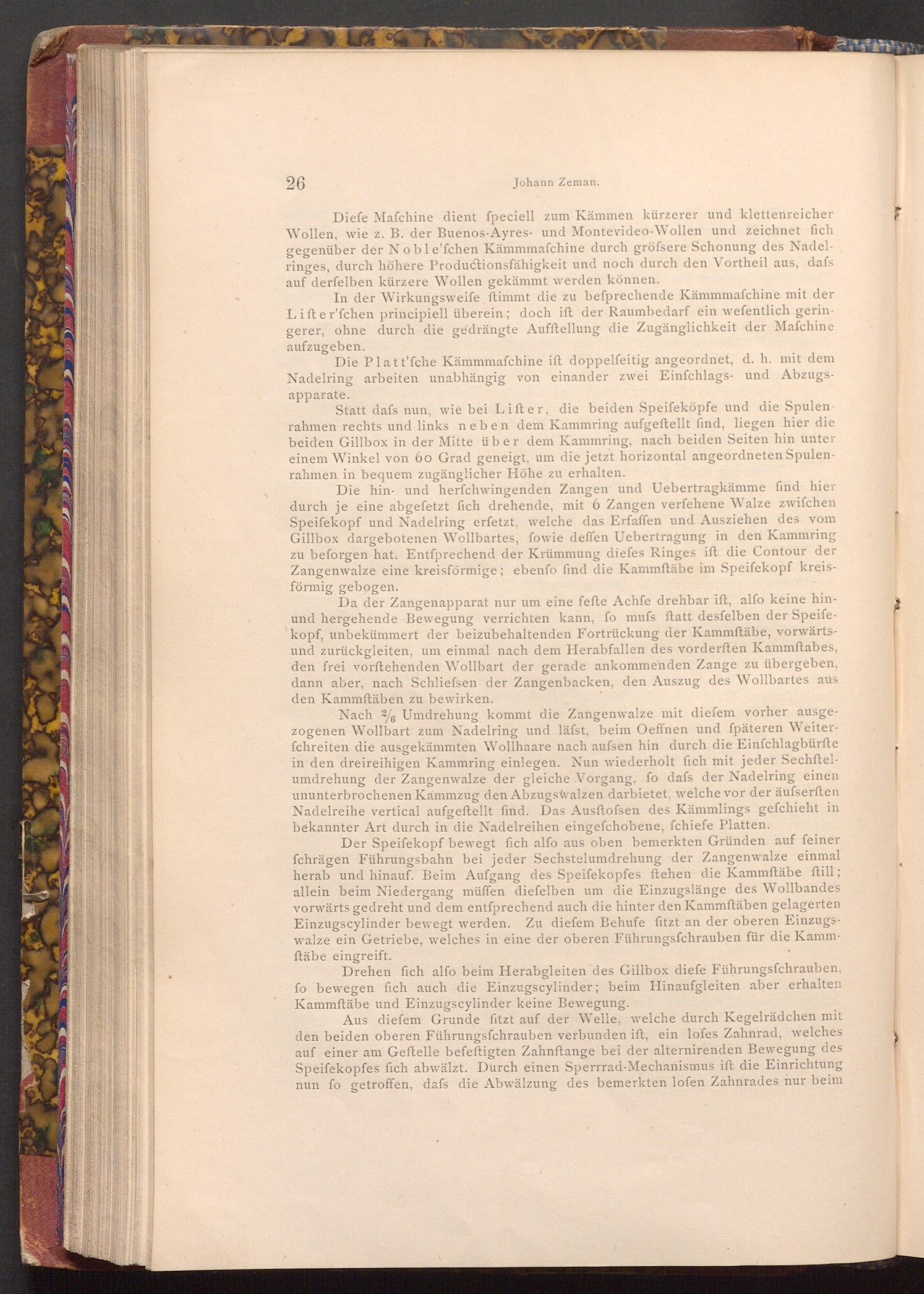Diefe Mafchine dient fpeciell zum Kämmen kürzerer und klettenreicher Wollen, wie z. B. der Buenos- Ayres- und Montevideo- Wollen und zeichnet fich gegenüber der Noble'fchen Kämmmafchine durch gröfsere Schonung des Nadelringes, durch höhere Productionsfähigkeit und noch durch den Vortheil aus, dafs auf derfelben kürzere Wollen gekämmt werden können.