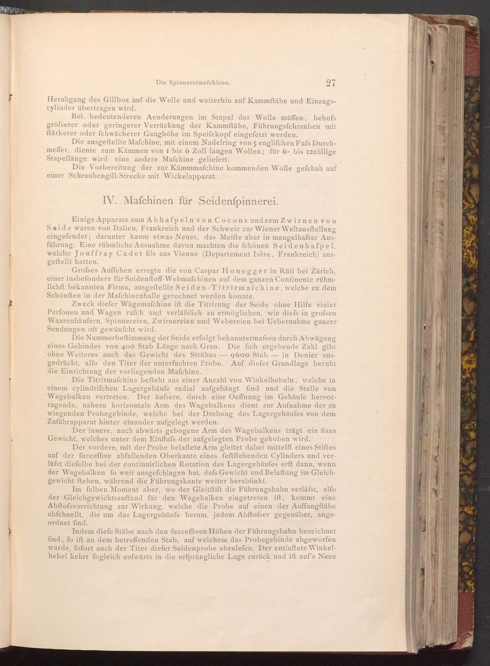 Grofses Auffehen erregte die von Caspar Honegger in Rüti bei Zürich, einer insbefondere für Seidenftoff- Webmaſchinen auf dem ganzen Continente rühmlichft bekannten Firma, ausgeftellte Seiden- Titrirmafchine, welche zu dem Schönften in der Mafchinenhalle gerechnet werden konnte.