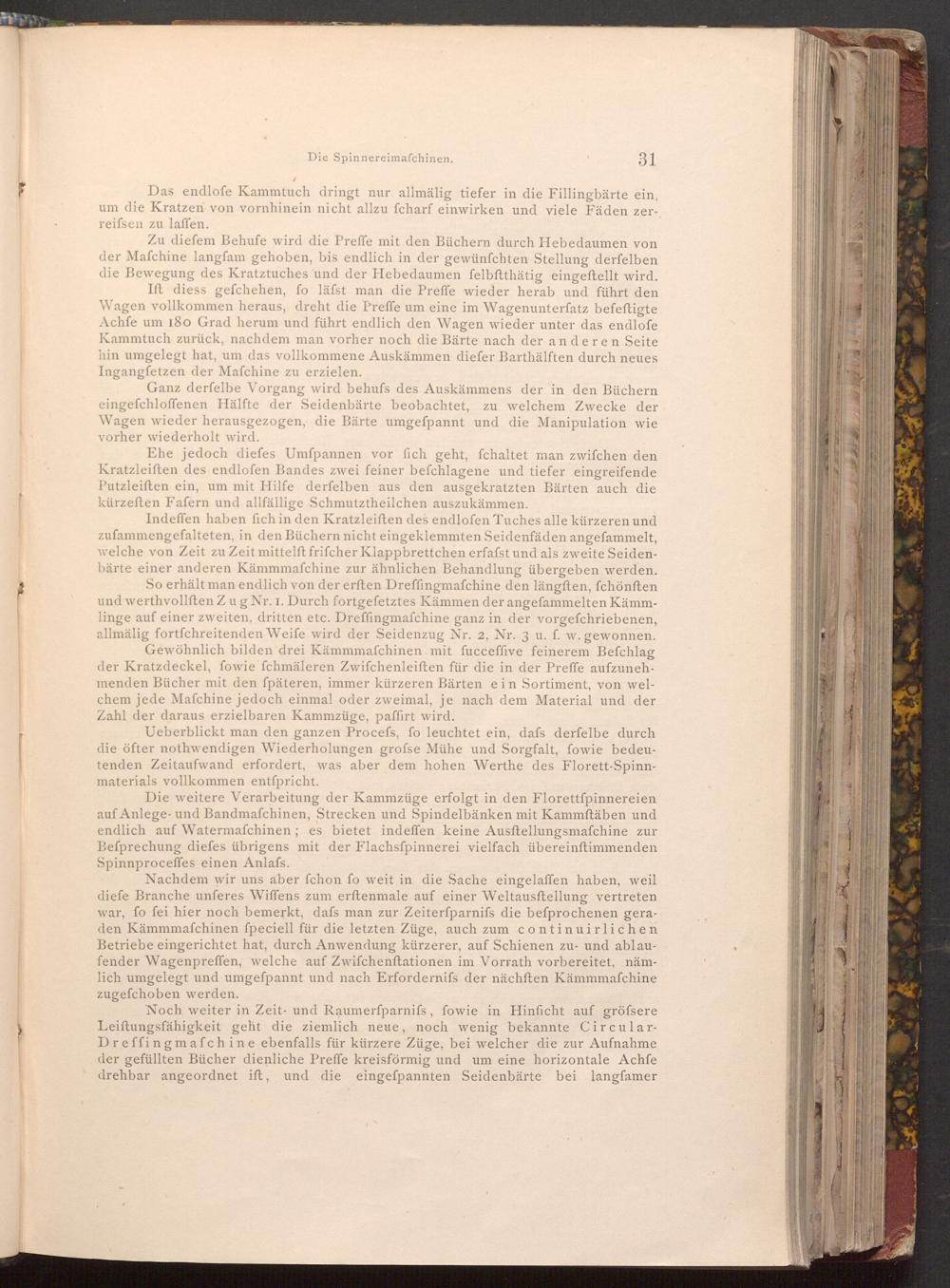 Die weitere Verarbeitung der Kammzüge erfolgt in den Florettfpinnereien auf Anlege- und Bandmafchinen, Strecken und Spindelbänken mit Kammftäben und endlich auf Watermafchinen; es bietet indeffen keine Ausstellungsmafchine zur Befprechung diefes übrigens mit der Flachsfpinnerei vielfach übereinftimmenden Spinnproceffes einen Anlafs.