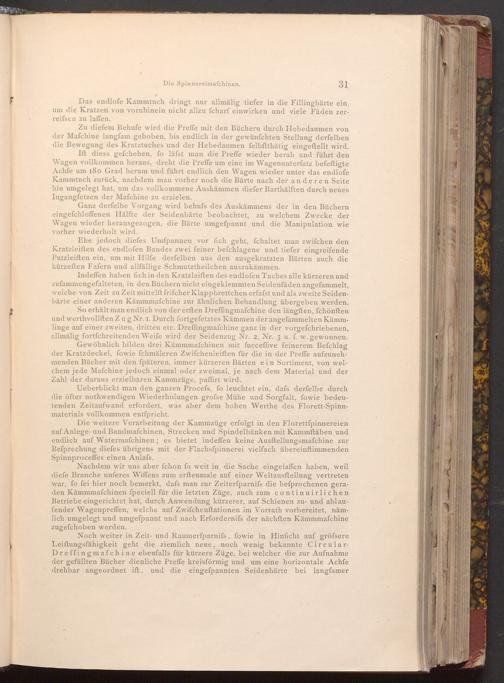 Noch weiter in Zeit- und Raumerfparnifs, fowie in Hinficht auf gröfsere Leiftungsfähigkeit geht die ziemlich neue, noch wenig bekannte CircularDreffingmafchine ebenfalls für kürzere Züge, bei welcher die zur Aufnahme der gefüllten Bücher dienliche Preffe kreisförmig und um eine horizontale Achfe drehbar angeordnet ift, und die eingeſpannten Seidenbärte bei langfamer