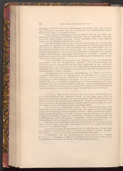 Deutfcherfeits war die mechanifche Kratzenfabrik, vormals. A. C. Lossius Nachfolger in Mittweida( Sachfen) mit Flachdraht- Kratzen aus geplättetem Runddraht zur Wiener Weltausftellung gekommen.