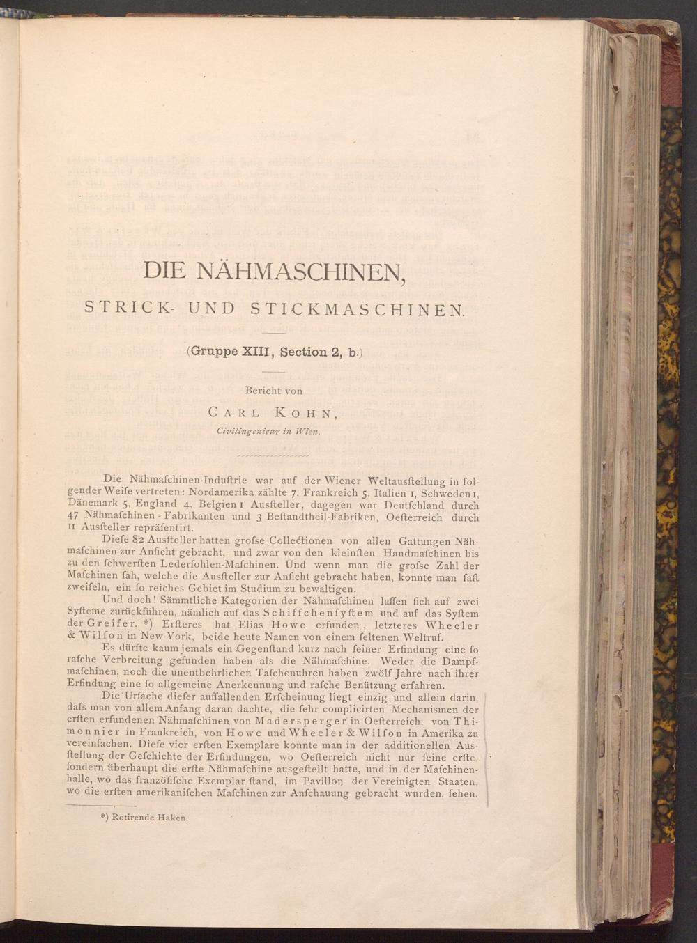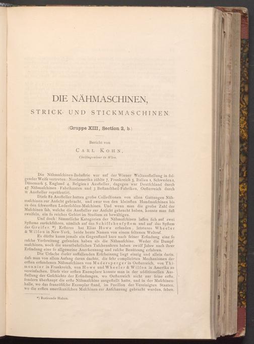 Die Urfache diefer auffallenden Erfcheinung liegt einzig und allein darin, dafs man von allem Anfang daran dachte, die fehr complicirten Mechanismen der erften erfundenen Nähmafchinen von Madersperger in Oefterreich, von Thimonnier in Frankreich, von Howe und Wheeler& Wilfon in Amerika zu vereinfachen. Diefe vier erften Exemplare konnte man in der additionellen Ausftellung der Gefchichte der Erfindungen, wo Oefterreich nicht nur feine erfte, fondern überhaupt die erfte Nähmafchine ausgeftellt hatte, und in der Maſchinenhalle, wo das franzöfifche Exemplar ftand, im Pavillon der Vereinigten Staaten, wo die erften amerikanifchen Mafchinen zur Anfchauung gebracht wurden, fehen.
