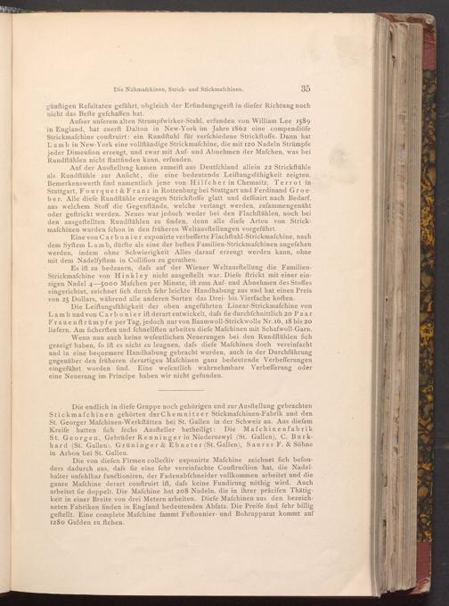Die endlich in diefe Gruppe noch gehörigen und zur Ausstellung gebrachten Stickmafchinen gehörten der Chemnitzer Stickmaſchinen- Fabrik und den St. Georger Mafchinen- Werkstätten bei St. Gallen in der Schweiz an. Aus diefem Kreife hatten fich fechs Ausfteller betheiligt: Die Mafchinenfabrik St. Georgen, Gebrüder Renninger in Niederuzwyl( St. Gallen), C. Burkhard( St. Gallen), Grüninger& Ebneter( St. Gallen), Saurer F.& Söhne in Arbon bei St. Gallen.