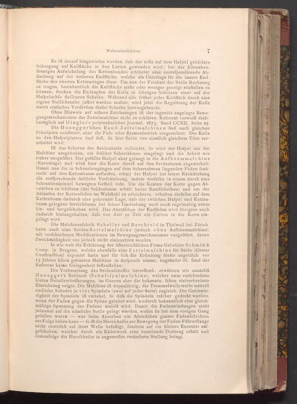 Ohne Hinweis auf nähere Zeichnungen ift der ingeniös angelegte Bewegungsmechanismus der Zettelmaſchine nicht zu erklären. Referent verweift diefsbezüglich auf Dingler's polytechnifches Journal, 1873, Band CCXII, Seite 25. Die Honegger'fchen Band- Zettelmafchinen find nach gleichen Principien conftruirt, aber für Fufs- oder Riemenbetrieb eingerichtet. Die Keile an den Hafpelplatten find feft, da hier Seide von ziemlich gleichem Titre verarbeitet wird.