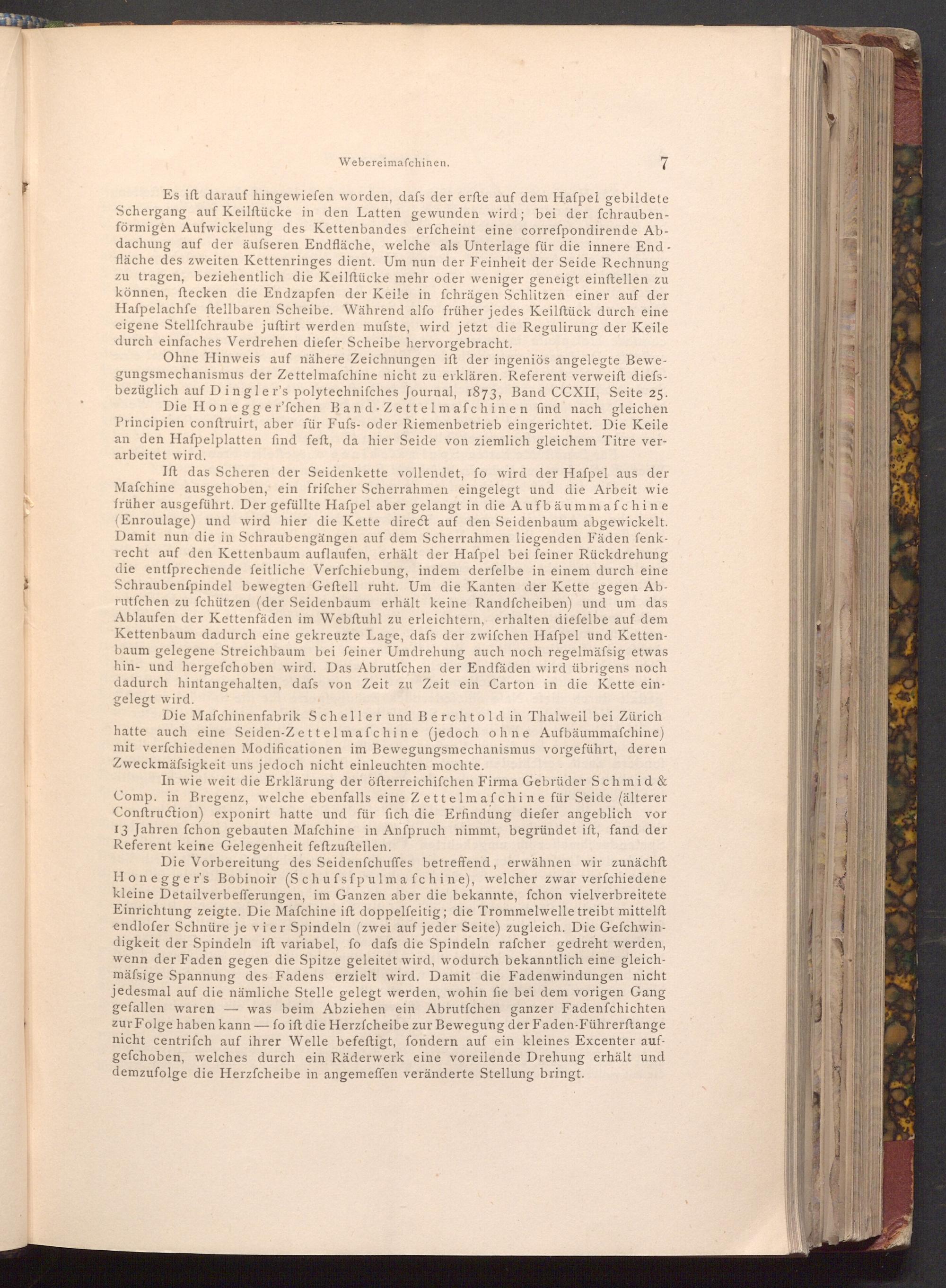 Die Mafchinenfabrik Scheller und Berchtold in Thalweil bei Zürich hatte auch eine Seiden- Zettelmafchine( jedoch ohne Aufbäummafchine) mit verfchiedenen Modificationen im Bewegungsmechanismus vorgeführt, deren Zweckmässigkeit uns jedoch nicht einleuchten mochte.