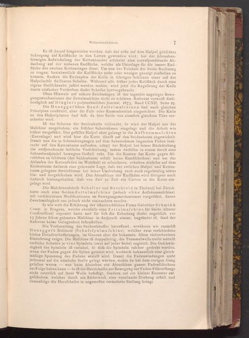 In wie weit die Erklärung der öfterreichifchen Firma Gebrüder Schmid& Comp. in Bregenz, welche ebenfalls eine Zettelmafchine für Seide( älterer Conftruction) exponirt hatte und für fich die Erfindung diefer angeblich vor 13 Jahren fchon gebauten Mafchine in Anspruch nimmt, begründet ift, fand der Referent keine Gelegenheit feftzuftellen.